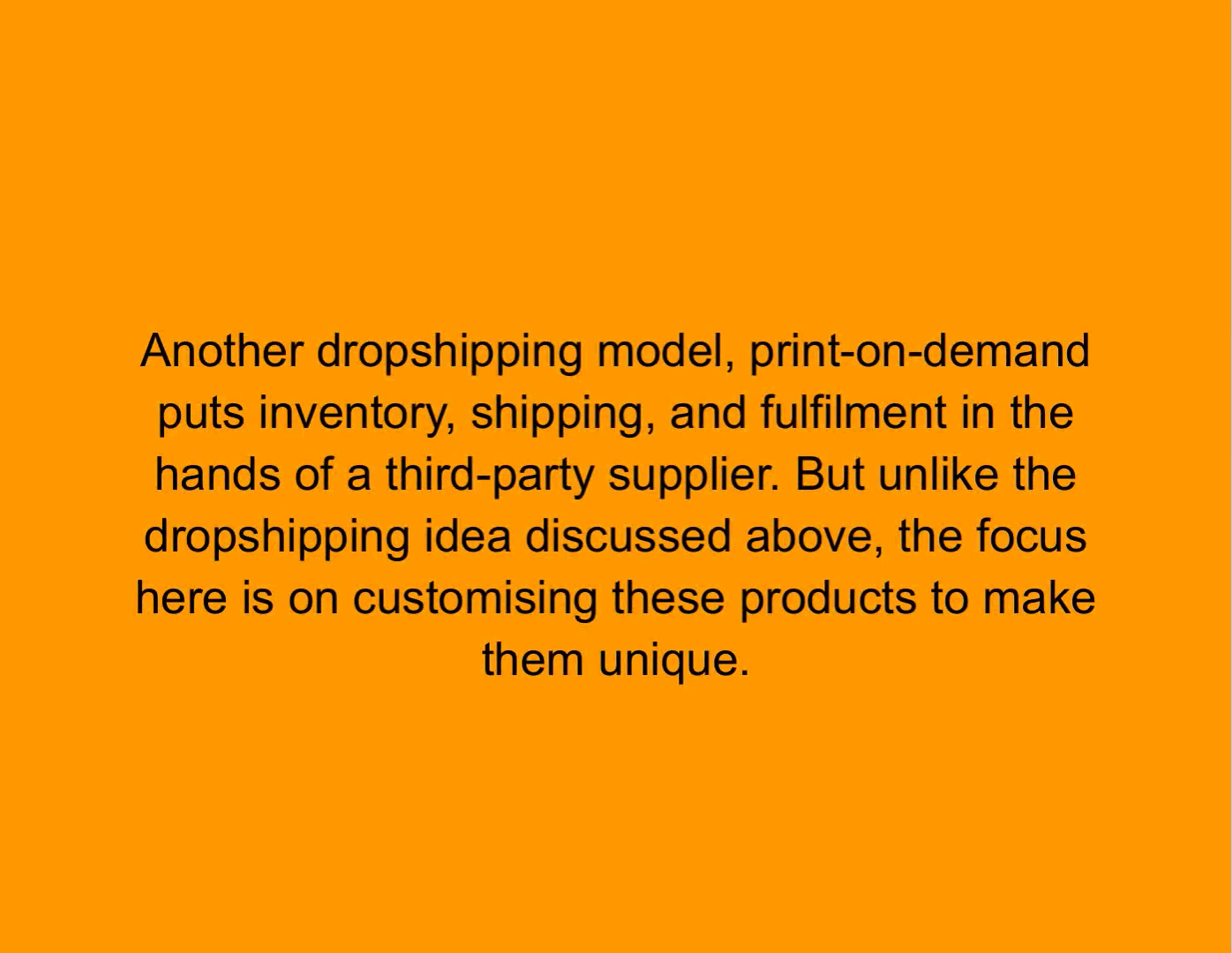 [Audio] Design and sell print-on-demand t-shirts Another dropshipping model, print-on-demand puts inventory, shipping, and fulfilment in the hands of a third-party supplier. But unlike the dropshipping idea discussed above, the focus here is on customising these products to make them unique..