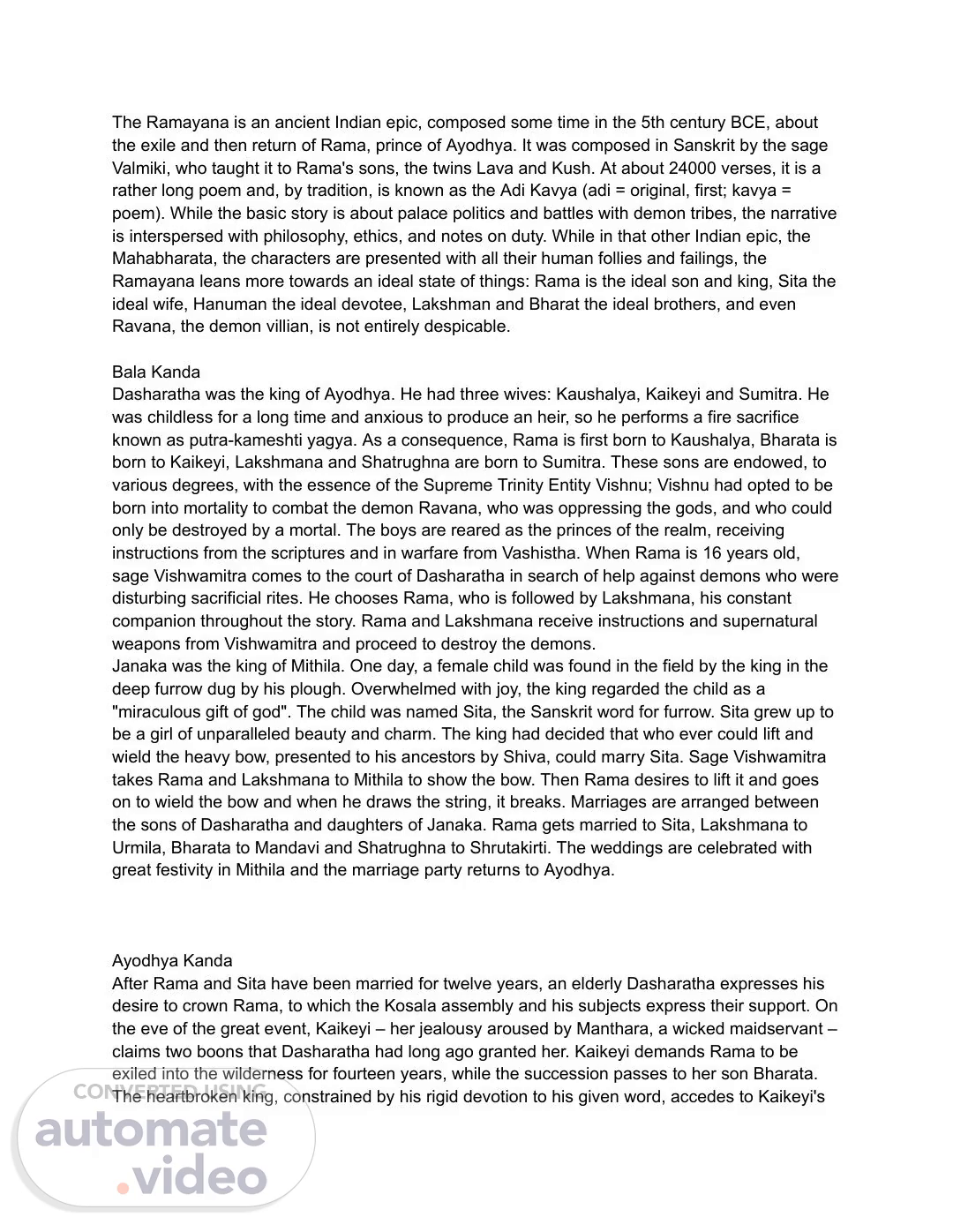The Ramayana is an ancient Indian epic, composed some time in the 5th century BCE, about the exile and then return of Rama, prince of Ayodhya. It was composed in Sanskrit by the sage Valmiki, who taught it to Rama's sons, the twins Lava and Kush. At about 24000 verses, it is a rather long poem and, by tradition, is known as the Adi Kavya (adi = original, first; kavya = poem). While the basic story is about palace politics and battles with demon tribes, the narrative is interspersed with philosophy, ethics, and notes on duty. While in that other Indian epic, the Mahabharata, the characters are presented with all their human follies and failings, the Ramayana leans more towards an ideal state of things: Rama is the ideal son and king, Sita the ideal wife, Hanuman the ideal devotee, Lakshman and Bharat the ideal brothers, and even Ravana, the demon villian, is not entirely despicable. Bala Kanda Dasharatha was the king of Ayodhya. He had three wives: Kaushalya, Kaikeyi and Sumitra. He was childless for a long time and anxious to produce an heir, so he performs a fire sacrifice known as putra-kameshti yagya. As a consequence, Rama is first born to Kaushalya, Bharata is born to Kaikeyi, Lakshmana and Shatrughna are born to Sumitra. These sons are endowed, to various degrees, with the essence of the Supreme Trinity Entity Vishnu; Vishnu had opted to be born into mortality to combat the demon Ravana, who was oppressing the gods, and who could only be destroyed by a mortal. The boys are reared as the princes of the realm, receiving instructions from the scriptures and in warfare from Vashistha. When Rama is 16 years old, sage Vishwamitra comes to the court of Dasharatha in search of help against demons who were disturbing sacrificial rites. He chooses Rama, who is followed by Lakshmana, his constant companion throughout the story. Rama and Lakshmana receive instructions and supernatural weapons from Vishwamitra and proceed to destroy the demons. Janaka was the king of Mithila. One day, a female child was found in the field by the king in the deep furrow dug by his plough. Overwhelmed with joy, the king regarded the child as a "miraculous gift of god". The child was named Sita, the Sanskrit word for furrow. Sita grew up to be a girl of unparalleled beauty and charm. The king had decided that who ever could lift and wield the heavy bow, presented to his ancestors by Shiva, could marry Sita. Sage Vishwamitra takes Rama and Lakshmana to Mithila to show the bow. Then Rama desires to lift it and goes on to wield the bow and when he draws the string, it breaks. Marriages are arranged between the sons of Dasharatha and daughters of Janaka. Rama gets married to Sita, Lakshmana to Urmila, Bharata to Mandavi and Shatrughna to Shrutakirti. The weddings are celebrated with great festivity in Mithila and the marriage party returns to Ayodhya. Ayodhya Kanda After Rama and Sita have been married for twelve years, an elderly Dasharatha expresses his desire to crown Rama, to which the Kosala assembly and his subjects express their support. On the eve of the great event, Kaikeyi – her jealousy aroused by Manthara, a wicked maidservant – claims two boons that Dasharatha had long ago granted her. Kaikeyi demands Rama to be exiled into the wilderness for fourteen years, while the succession passes to her son Bharata. The heartbroken king, constrained by his rigid devotion to his given word, accedes to Kaikeyi's.