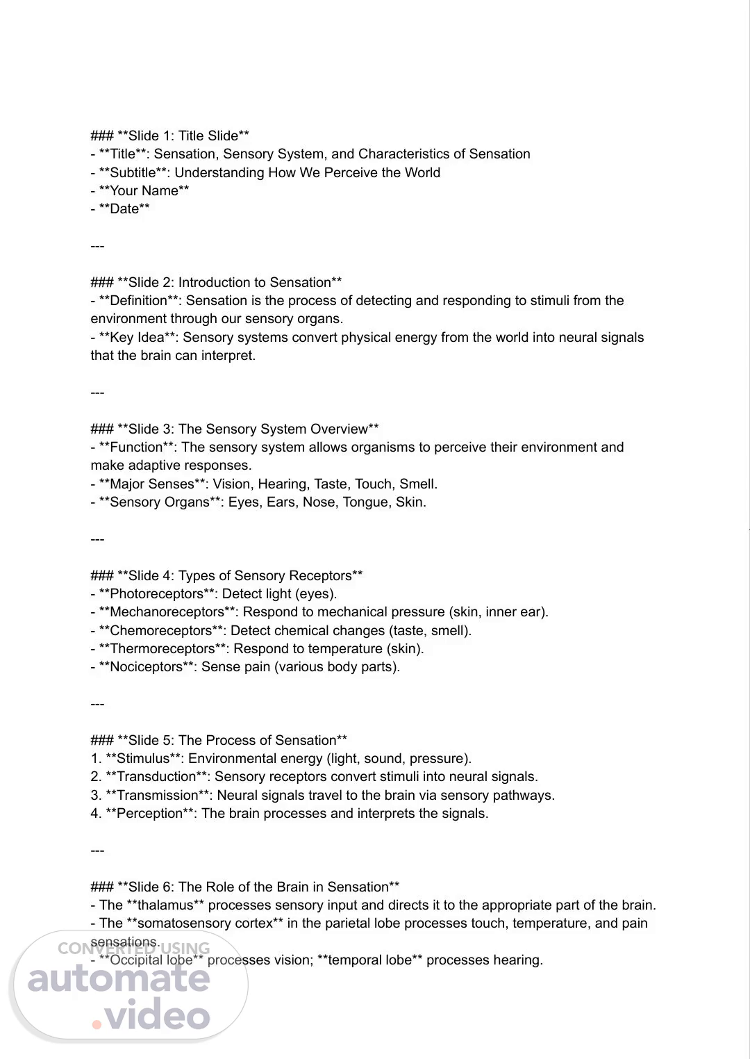 [Audio] ### **Slide 1: Title Slide** **Title**: Sensation, Sensory System, and Characteristics of Sensation **Subtitle**: Understanding How We Perceive the World **Your Name** **Date** --### **Slide 2: Introduction to Sensation** **Definition**: Sensation is the process of detecting and responding to stimuli from the environment through our sensory organs. **Key Idea**: Sensory systems convert physical energy from the world into neural signals that the brain can interpret. --### **Slide 3: The Sensory System Overview** **Function**: The sensory system allows organisms to perceive their environment and make adaptive responses. **Major Senses**: Vision, Hearing, Taste, Touch, Smell. **Sensory Organs**: Eyes, Ears, Nose, Tongue, Skin. --### **Slide 4: Types of Sensory Receptors** **Photoreceptors**: Detect light (eyes). **Mechanoreceptors**: Respond to mechanical pressure (skin, inner ear). **Chemoreceptors**: Detect chemical changes (taste, smell). **Thermoreceptors**: Respond to temperature (skin). **Nociceptors**: Sense pain (various body parts). --### **Slide 5: The Process of Sensation** 1. **Stimulus**: Environmental energy (light, sound, pressure). 2. **Transduction**: Sensory receptors convert stimuli into neural signals. 3. **Transmission**: Neural signals travel to the brain via sensory pathways. 4. **Perception**: The brain processes and interprets the signals. --### **Slide 6: The Role of the Brain in Sensation** The **thalamus** processes sensory input and directs it to the appropriate part of the brain. The **somatosensory cortex** in the parietal lobe processes touch, temperature, and pain sensations. **Occipital lobe** processes vision; **temporal lobe** processes hearing..