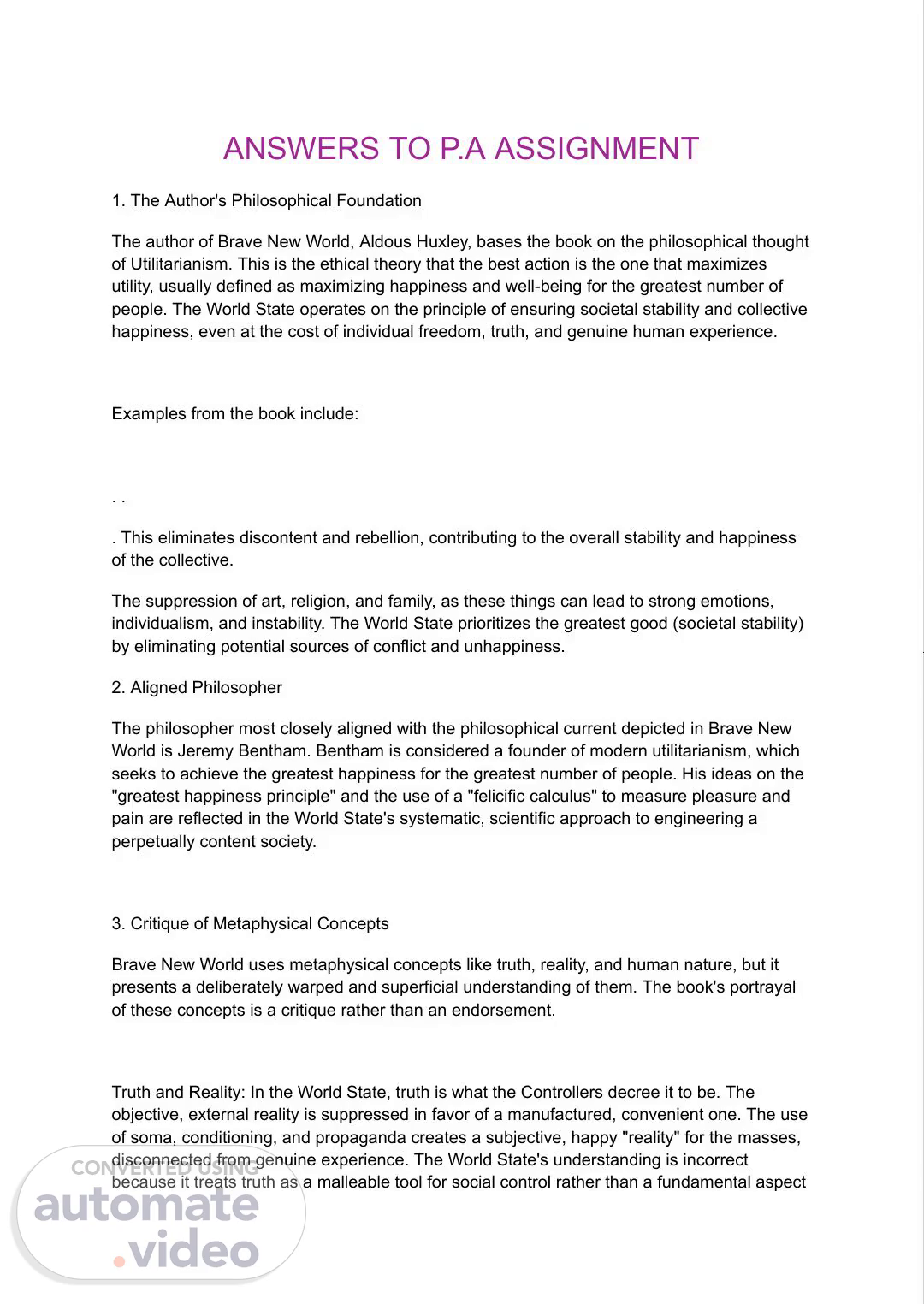 [Audio] In our previous discussion, we examined the concepts in Aldous Huxley's novel Brave New World and how they connect to modern life in Kenya. Now, let's explore the impact of Utilitarianism in the book. The World State's focus on societal stability and collective happiness, at the expense of individual freedom and truth, closely aligns with philosopher Jeremy Bentham's ideas. We can see this in the initial chapters, with the themes of social conditioning, consumerism, and the pursuit of happiness through materialistic means. Let's first look at consumerism. The World State promotes consumption as a means of societal stability, as seen in their motto "Ending is better than mending." This mirrors the consumer culture in Kenya, where we are bombarded with advertisements and social media messages urging us to spend money on new products, leading to a cycle of constant dissatisfaction and consumption. Similarly, the use of "soma" in Brave New World as a form of escape has parallels in modern life, with social media, binge-watching, and substance use providing temporary relief from daily challenges. Another concept present in both the book and in Kenya is social stratification. While not as extreme as the caste system in the novel, Kenya still experiences significant socioeconomic divisions, with certain opportunities and institutions being accessible only to those from specific social or financial backgrounds. Moving on, the next topic we will discuss is the subversion of the transcendentals – truth, goodness, and beauty – in the book. In Brave New World, truth is replaced by convenience and social utility, as the World State deliberately deceives its citizens in order to maintain control and happiness, making truth an enemy of societal stability. Goodness is redefined as social conformity and obedience, with actions being considered "good" if they contribute to collective harmony, rather than possessing moral virtues. This reduces morality to what is functional for the World State. Lastly, beauty in the book is described as shallow and mass-produced..