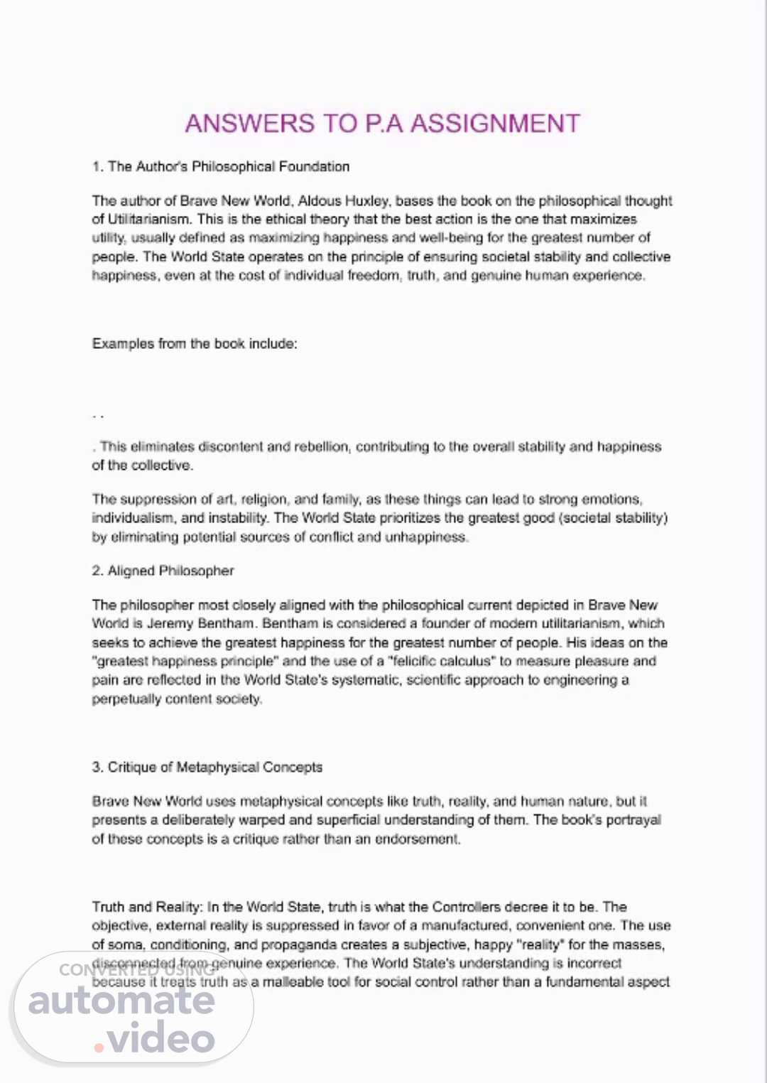 ANSWERS TO P.A ASSIGNMENT 1. The Author's Philosophical Foundation The author of Brave New World, Aldous Huxley, bases the book on the philosophical thought of Utilitarianism. This is the ethical theory that the best action is the one that maximizes utility, usually defined as maximizing happiness and well-being for the greatest number of people. The World State operates on the principle of ensuring societal stability and collective happiness, even at the cost of individual freedom, truth, and genuine human experience. Examples from the book include: . . . This eliminates discontent and rebellion, contributing to the overall stability and happiness of the collective. The suppression of art, religion, and family, as these things can lead to strong emotions, individualism, and instability. The World State prioritizes the greatest good (societal stability) by eliminating potential sources of conflict and unhappiness. 2. Aligned Philosopher The philosopher most closely aligned with the philosophical current depicted in Brave New World is Jeremy Bentham. Bentham is considered a founder of modern utilitarianism, which seeks to achieve the greatest happiness for the greatest number of people. His ideas on the "greatest happiness principle" and the use of a "felicific calculus" to measure pleasure and pain are reflected in the World State's systematic, scientific approach to engineering a perpetually content society. 3. Critique of Metaphysical Concepts Brave New World uses metaphysical concepts like truth, reality, and human nature, but it presents a deliberately warped and superficial understanding of them. The book's portrayal of these concepts is a critique rather than an endorsement. Truth and Reality: In the World State, truth is what the Controllers decree it to be. The objective, external reality is suppressed in favor of a manufactured, convenient one. The use of soma, conditioning, and propaganda creates a subjective, happy "reality" for the masses, disconnected from genuine experience. The World State's understanding is incorrect because it treats truth as a malleable tool for social control rather than a fundamental aspect.
