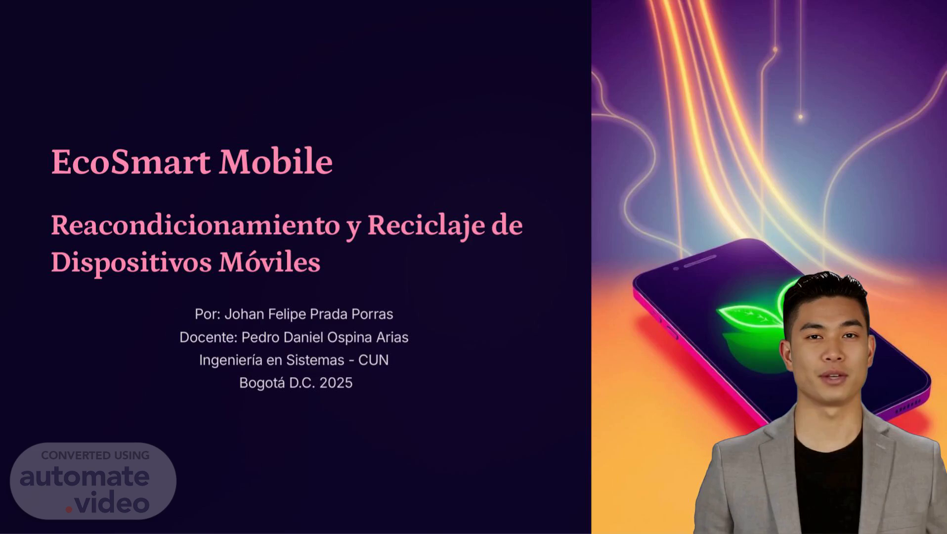 [Virtual Presenter] La bienvenida a nuestro proyecto EcoSmart Mobile, donde se busca darle una segunda oportunidad a los dispositivos móviles, reducir el impacto ambiental y promover la sostenibilidad. En este proyecto, se explora cómo se puede hacer una diferencia positiva en el mundo a través de nuestra empresa y las estrategias que utilizamos para lograrlo..