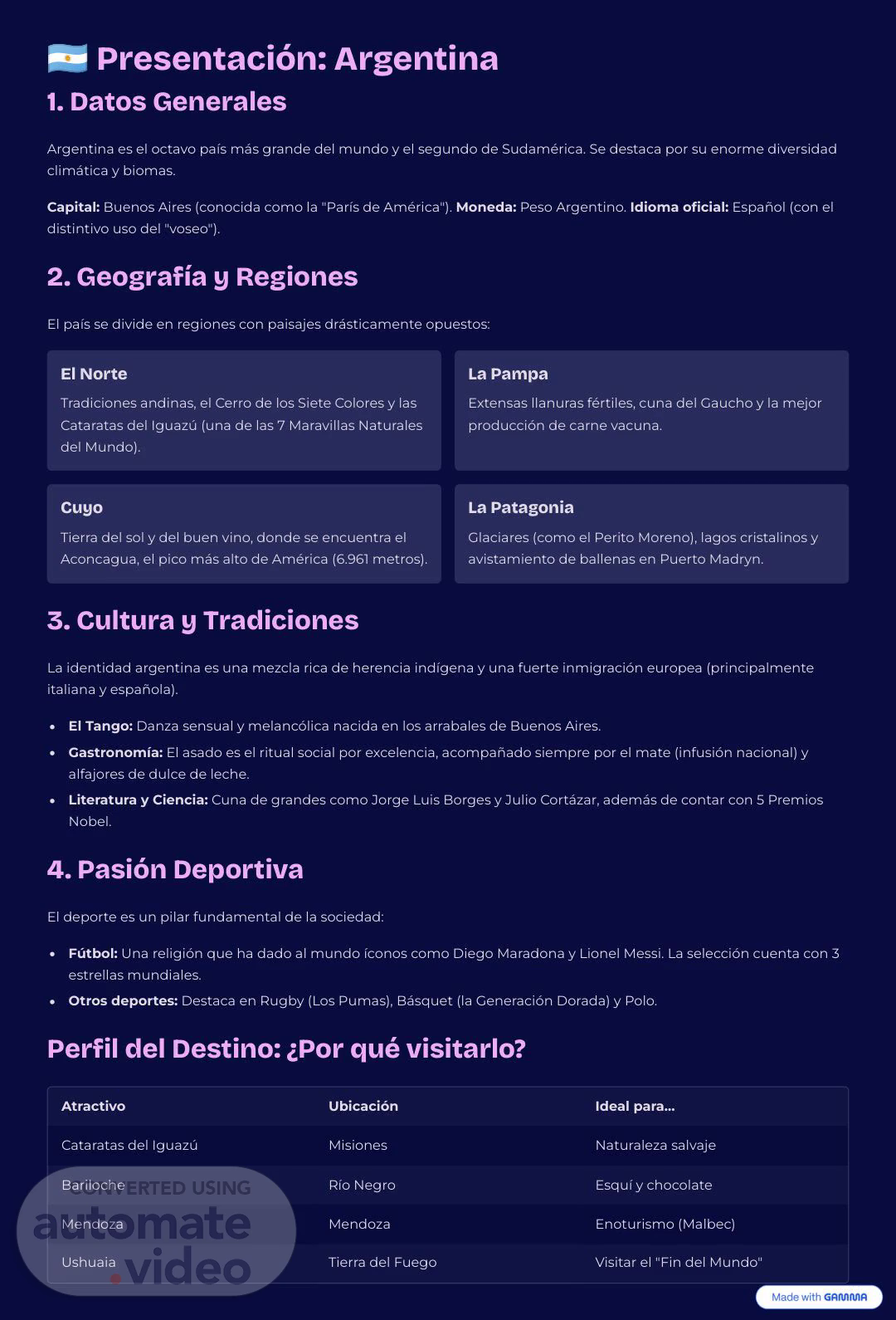 Presentación: Argentina 1. Datos Generales Argentina es el octavo país más grande del mundo y el segundo de Sudamérica. Se destaca por su enorme diversidad climática y biomas. Capital: Buenos Aires (conocida como la "París de América"). Moneda: Peso Argentino. Idioma oficial: Español (con el distintivo uso del "voseo"). 2. Geografía y Regiones El país se divide en regiones con paisajes drásticamente opuestos: El Norte Tradiciones andinas, el Cerro de los Siete Colores y las Cataratas del Iguazú (una de las 7 Maravillas Naturales del Mundo). La Pampa Extensas llanuras fértiles, cuna del Gaucho y la mejor producción de carne vacuna. Cuyo Tierra del sol y del buen vino, donde se encuentra el Aconcagua, el pico más alto de América (6.961 metros). La Patagonia Glaciares (como el Perito Moreno), lagos cristalinos y avistamiento de ballenas en Puerto Madryn. 3. Cultura y Tradiciones La identidad argentina es una mezcla rica de herencia indígena y una fuerte inmigración europea (principalmente italiana y española). El Tango: Danza sensual y melancólica nacida en los arrabales de Buenos Aires. Gastronomía: El asado es el ritual social por excelencia, acompañado siempre por el mate (infusión nacional) y alfajores de dulce de leche. Literatura y Ciencia: Cuna de grandes como Jorge Luis Borges y Julio Cortázar, además de contar con 5 Premios Nobel. 4. Pasión Deportiva El deporte es un pilar fundamental de la sociedad: Fútbol: Una religión que ha dado al mundo íconos como Diego Maradona y Lionel Messi. La selección cuenta con 3 estrellas mundiales. Otros deportes: Destaca en Rugby (Los Pumas), Básquet (la Generación Dorada) y Polo. Perfil del Destino: ¿Por qué visitarlo? Atractivo Ubicación Ideal para... Cataratas del Iguazú Misiones Naturaleza salvaje Bariloche Río Negro Esquí y chocolate Mendoza Mendoza Enoturismo (Malbec) Ushuaia Tierra del Fuego Visitar el "Fin del Mundo".