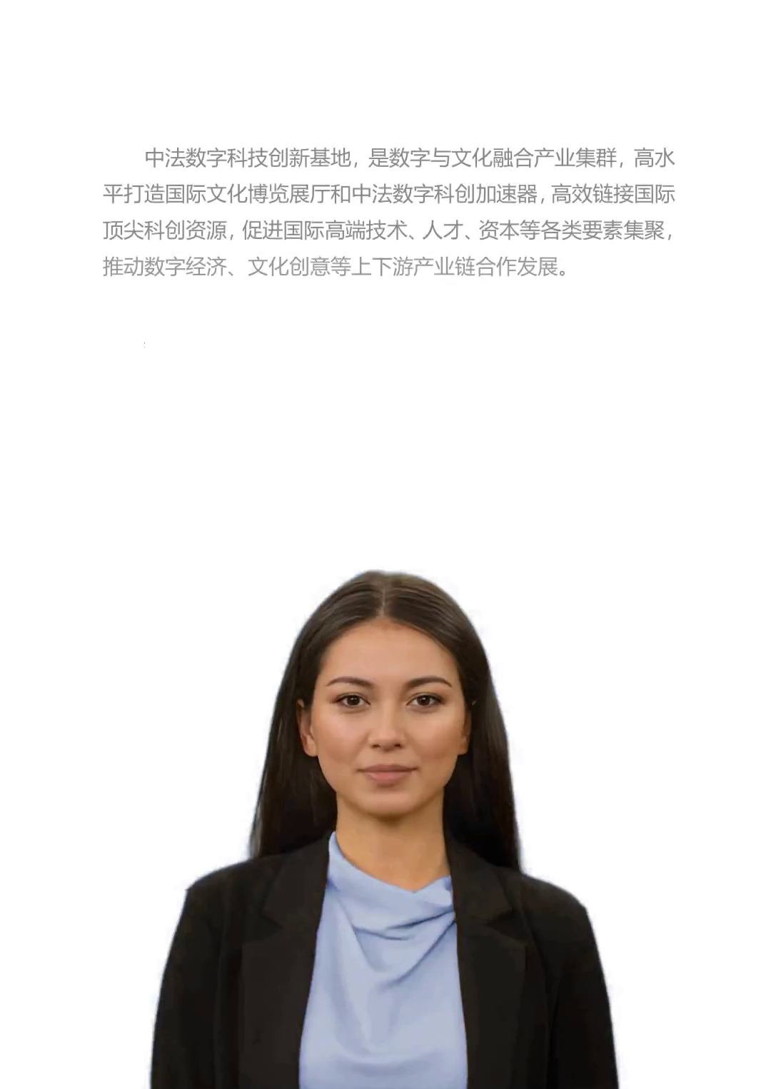 [Virtual Presenter] 新型数字经济,文化创意深度融合",是中法数字科创加速器的主旨。以“文化与科技融合落地的突破力量,探索新型数字经济发展新方式;以创新、智能科技为纽带,深度融合文化创意的力量,释放新业态、新模式等新动能,引领文化产业的变革。" 中法数字科技创新基地旨在通过“文化与科技融合”,构建拥有全球影响力的创新型产业集群,推动数字科技创新发展,促进文化创意深度融合,最终为构建中国数字强国发展提供支撑。.