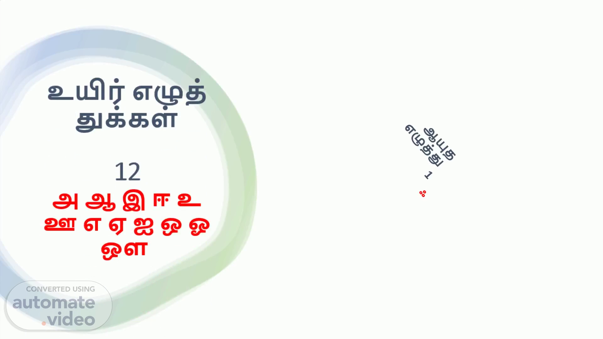 உயிர் எழுத்துக்கள் 12 அ ஆ இ ஈ உ ஊ எ ஏ ஐ ஒ ஓ ஔ. ஆயுத எழுத்து 1 ஃ.