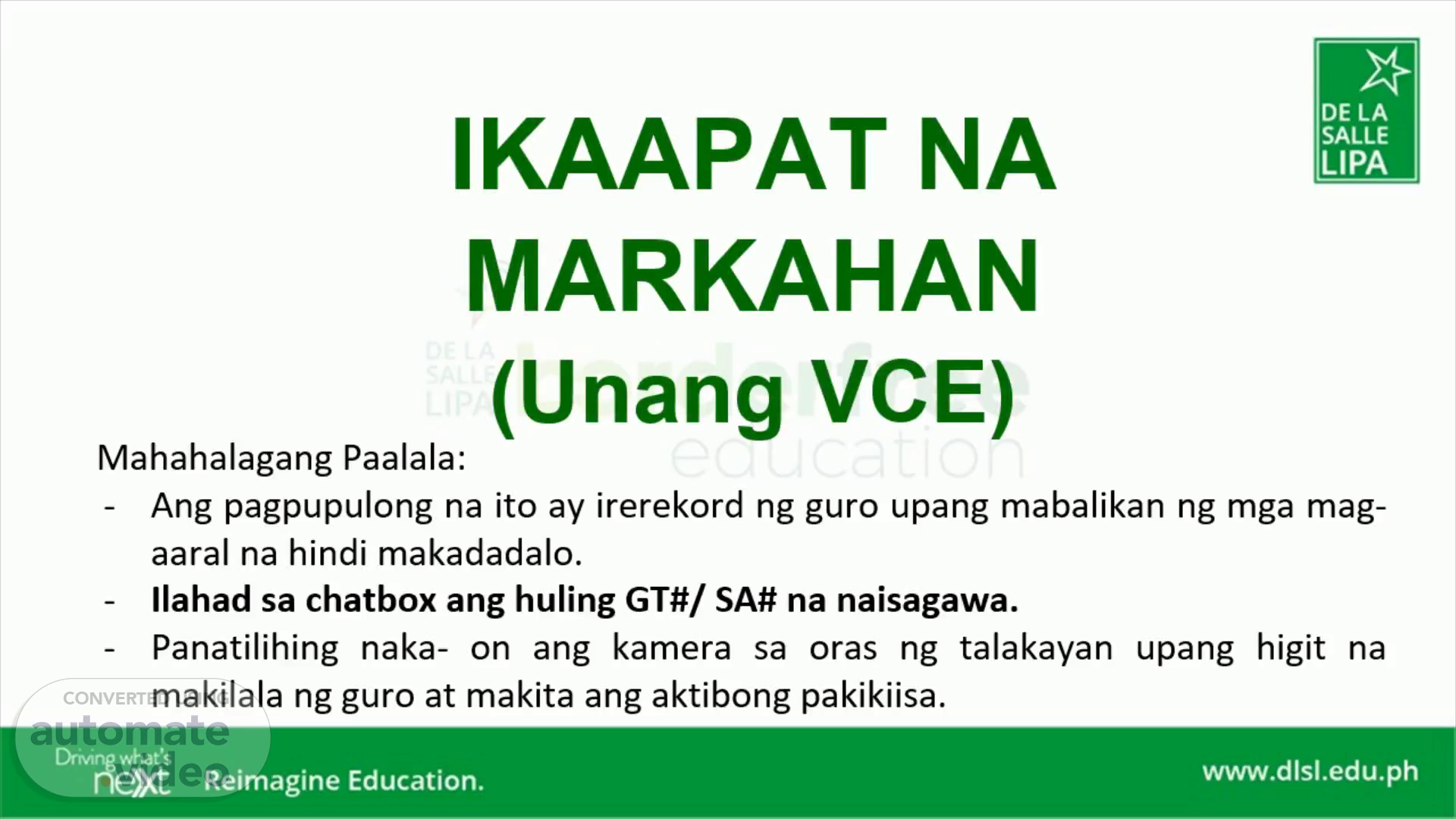 IKAAPAT NA MARKAHAN (Unang VCE). Mahahalagang Paalala: Ang pagpupulong na ito ay irerekord ng guro upang mabalikan ng mga mag- aaral na hindi makadadalo. Ilahad sa chatbox ang huling GT#/ SA# na naisagawa. Panatilihing naka- on ang kamera sa oras ng talakayan upang higit na makilala ng guro at makita ang aktibong pakikiisa..