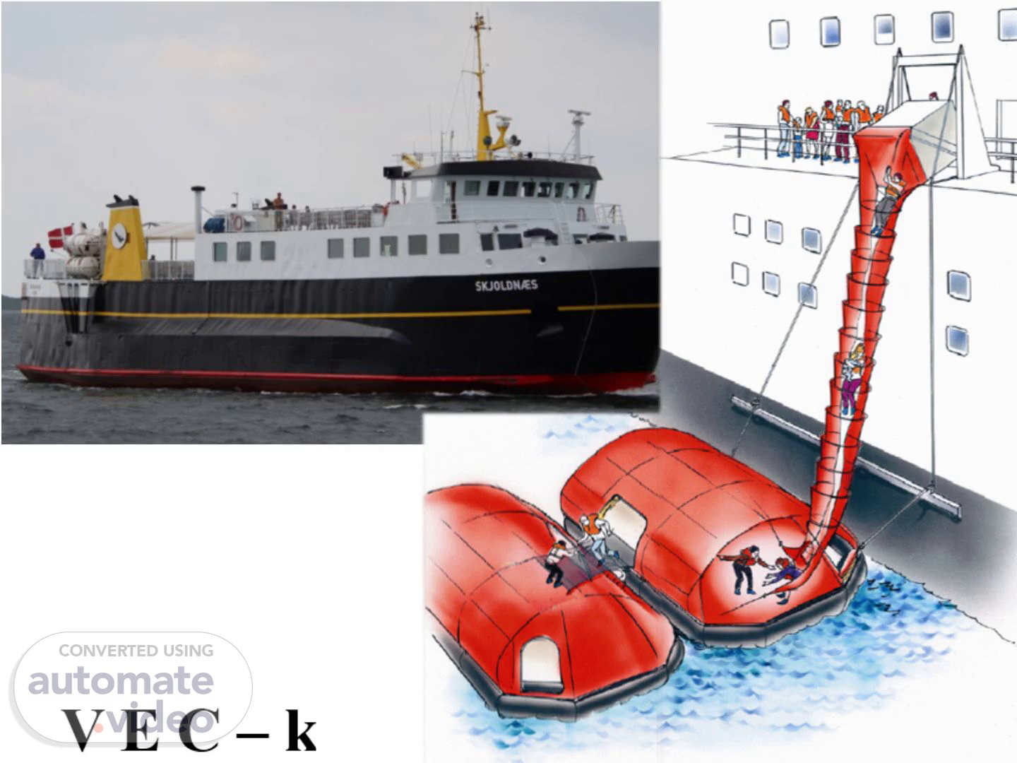 Lovgivning Meddelelser fra Søfartsstyrelsen: Kapitel D lll, regel 13.4 med henvisning til SOLAS Kapitel B lll, regel 19.3.4.8. Hvis et skib er udrustet med marine-evakuerings-systemer (MES), skal øvelser inkludere træning i procedurerne krævet ved anvendelse af et sådant system helt op til et punkt, som er lige før egentlig udløsning af systemet. Denne type af øvelser skal suppleres med almindelige instruktioner ved hjælp af de ombordværende træningsmidler krævet i regel 35.5. Hver deltager i bemandingen af marine-evakuerings-systemer (MES) skal yderligere trænes – så meget som praktisk muligt – til deltagelse i udsætning af et sådant system i vandet, enten om bord på et skib eller på land med 2 års mellemrum, men i intet tilfælde med et større mellemrum end 3 år. SOLAS Kapitel B lll, regel 20.8.2. I tillæg til eller samtidig med serviceeftersynene på marine-evakuerings-systemer (MES) krævet i stk. 8.1 skal hvert marine-evakuerings-system udsættes fra skibet på skift og med mellemrum godkendt af Administrationen, under forudsætning af at hvert system udnyttes mindst en gang hvert 6. år. SOLAS Kapitel B lll, regel 35.5. Ethvert skib, som er forsynet med et marine-evakuerings-system (MES), skal have hjælpemidler til træning og øvelser om bord (fx. instruktionsbøger og videofilm)..
