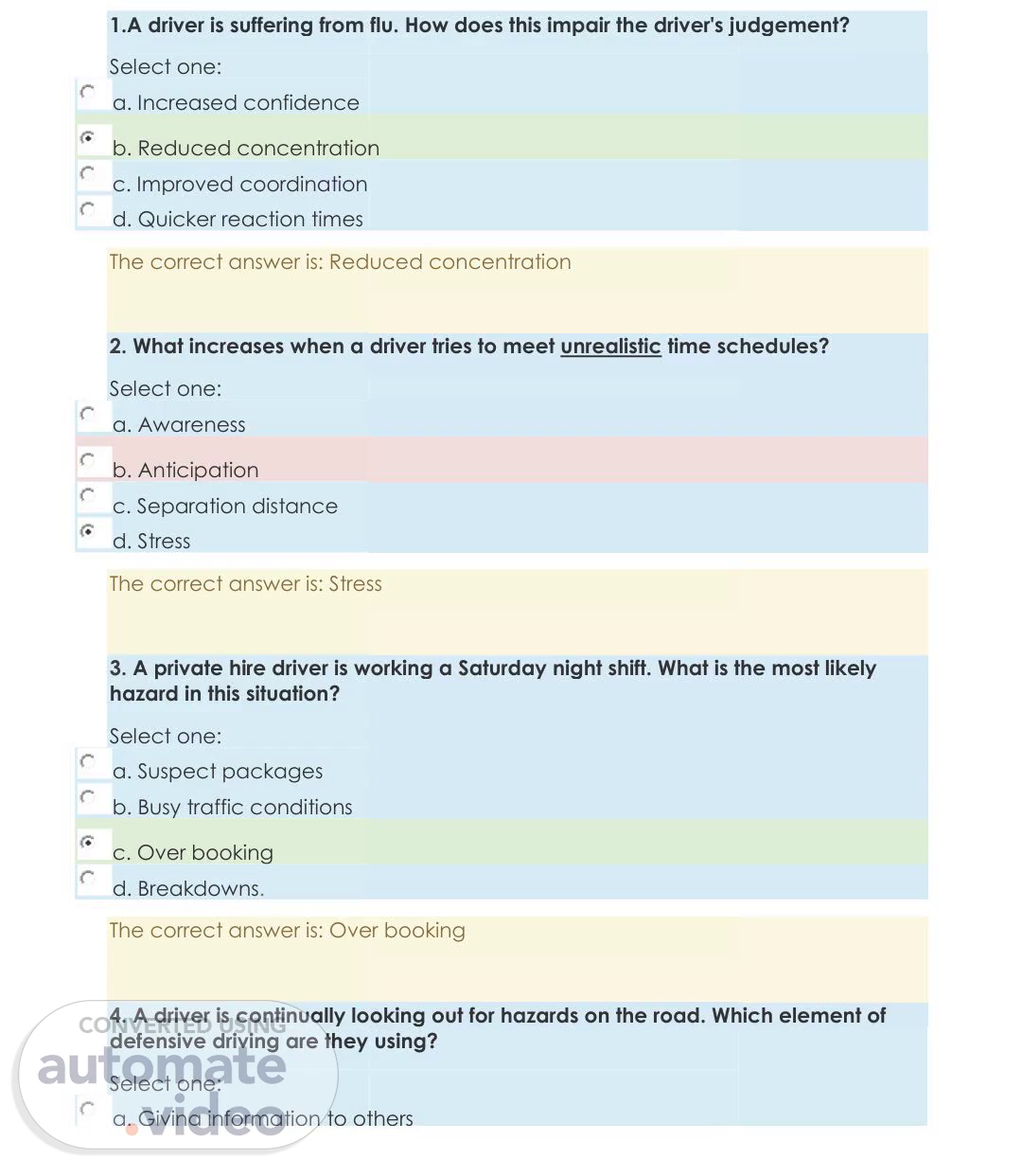 [Audio] 1.A driver is suffering from flu. How does this impair the driver's judgement? A driver is suffering from flu. How does this impair the driver's judgement? A driver is suffering from flu. How does this impair the driver's judgement? Select one: a. Increased confidence b. Reduced concentration b. Reduced concentration c. Improved coordination d. Quicker reaction times The correct answer is: Reduced concentration The correct answer is: Reduced concentration 2. What increases when a driver tries to meet What increases when a driver tries to meet unrealistic time schedules? time schedules? Select one: a. Awareness b. Anticipation c. Separation distance d. Stress The correct answer is: Stress answer is: Stress A private hire driver is working a Saturday night shift. What is the A private hire driver is working a Saturday night shift. What is the most likely 3. A private hire driver is working a Saturday night shift. What is the hazard in this situation? Select one: a. Suspect packages b. Busy traffic conditions c. Over booking d. Breakdowns. The correct answer is: Over The correct answer is: Over booking A driver is continually looking out for hazards on the road. Which element of A driver is continually looking out for hazards on the road. Which element of 4. A driver is continually looking out for hazards on the road. Which element of defensive driving are they using? defensive driving are they using? Select one: a. Giving information to others a. Giving information to others.