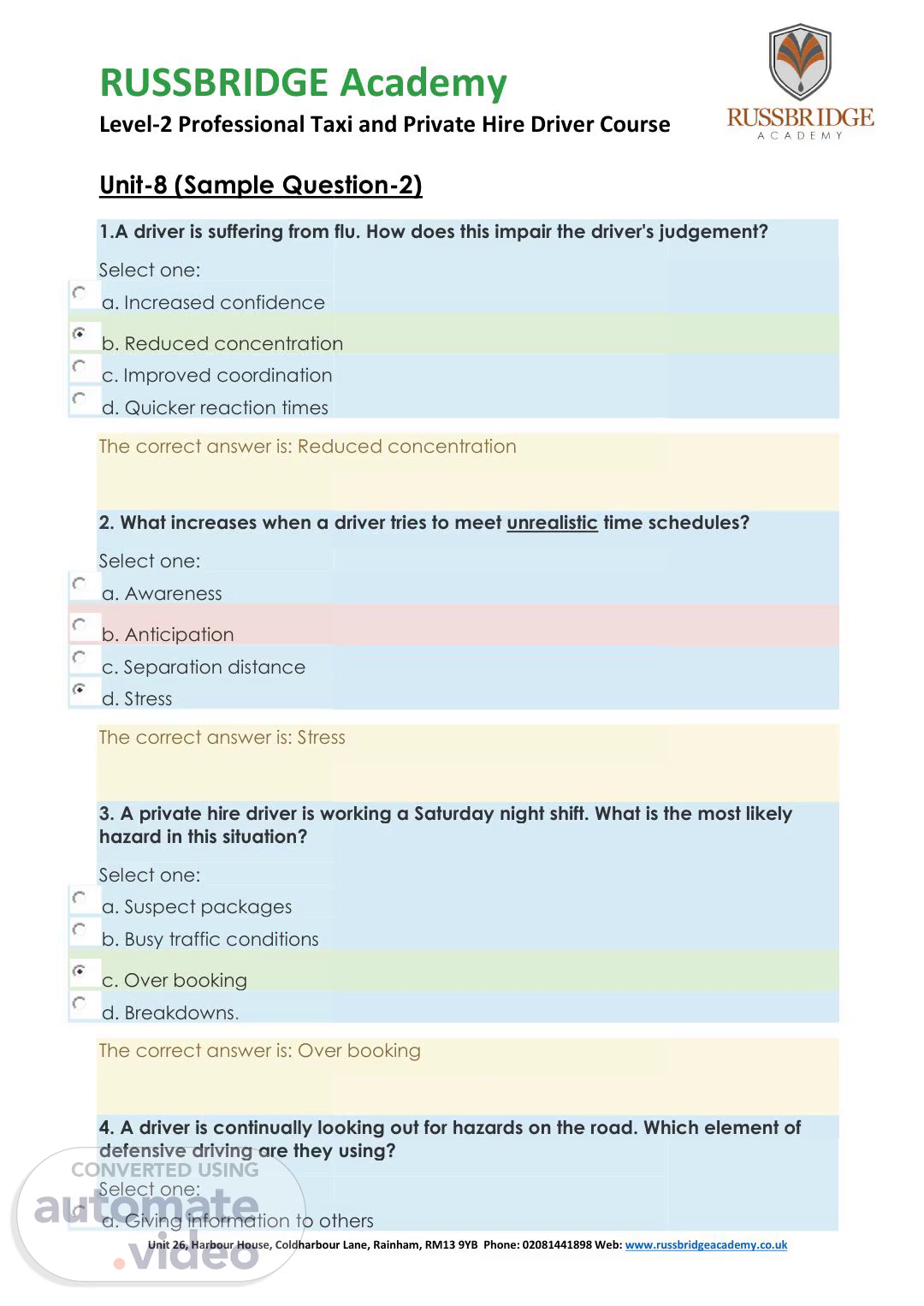 [Audio] RUSSBRIDGE Academy 2 Professional Taxi and Private Hire Driver Course 2 Professional Taxi and Private Hire Driver Course RUSSBRIDGE Academy Level-2 Professional Taxi and Private Hire Driver Course Unit-8 (Sample Question 8 (Sample Question-2) 1.A driver is suffering from flu. How does this impair the driver's judgement? A driver is suffering from flu. How does this impair the driver's judgement? A driver is suffering from flu. How does this impair the driver's judgement? Select one: a. Increased confidence b. Reduced concentration b. Reduced concentration c. Improved coordination d. Quicker reaction times The correct answer is: Reduced concentration The correct answer is: Reduced concentration 2. What increases when a driver tries to meet What increases when a driver tries to meet unrealistic time schedules? time schedules? Select one: a. Awareness b. Anticipation c. Separation distance d. Stress The correct answer is: Stress answer is: Stress A private hire driver is working a Saturday night shift. What is the A private hire driver is working a Saturday night shift. What is the most likely 3. A private hire driver is working a Saturday night shift. What is the hazard in this situation? Select one: a. Suspect packages b. Busy traffic conditions c. Over booking d. Breakdowns. The correct answer is: Over The correct answer is: Over booking A driver is continually looking out for hazards on the road. Which element of A driver is continually looking out for hazards on the road. Which element of 4. A driver is continually looking out for hazards on the road. Which element of defensive driving are they using? defensive driving are they using? Select one: a. Giving information to others a. Giving information to others Unit 26, Harbour House, Coldharbour Lane, Rainham Unit 26, Harbour House, Coldharbour Lane, Rainham, RM13 9YB Phone: 02081441898 Web: www.russbridgeacademy.co.uk www.russbridgeacademy.co.uk.