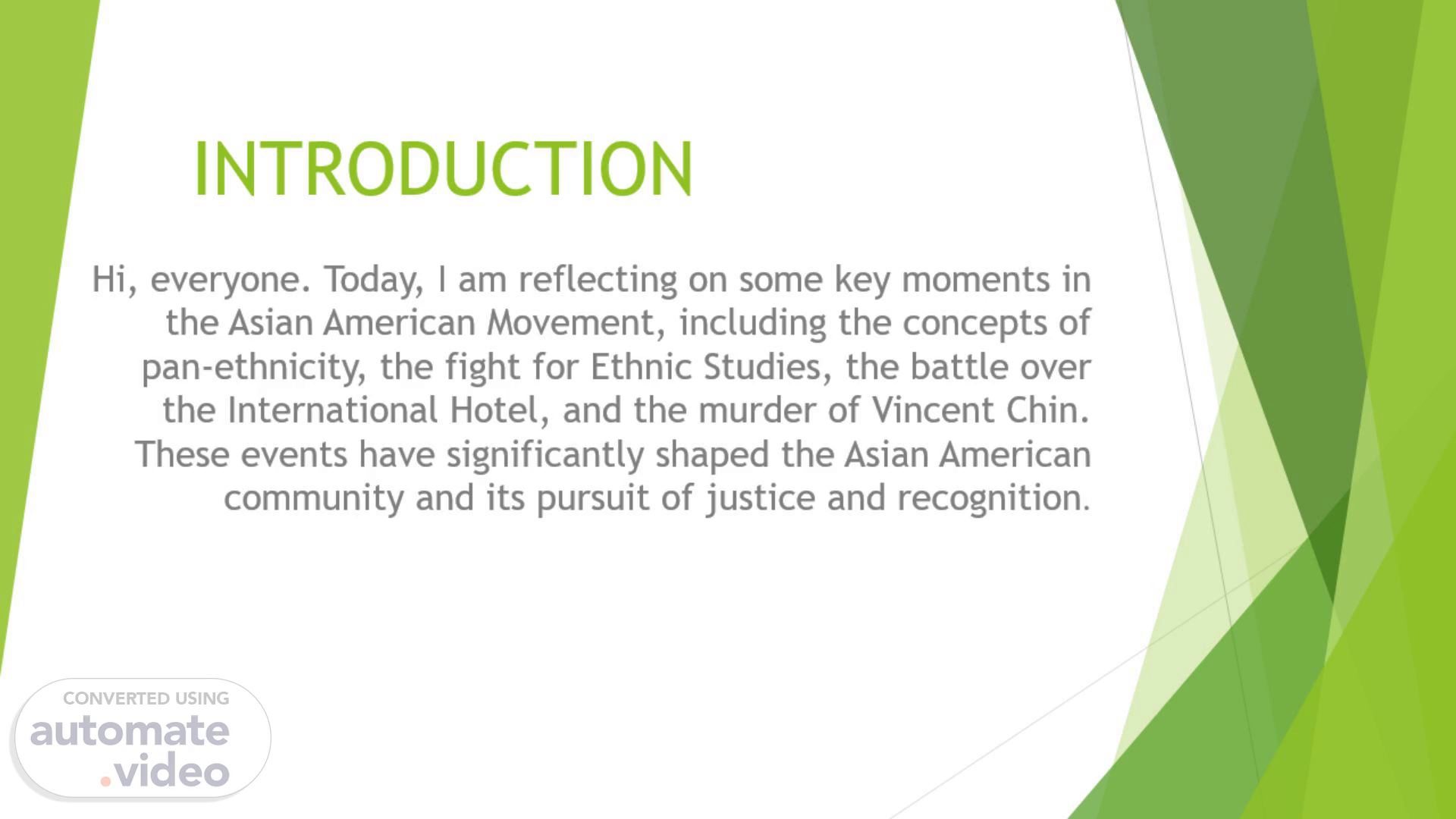 [Audio] INTRODUCTION Hi, everyone. Today, I am reflecting on some key moments in the Asian American Movement, including the concepts of pan-ethnicity, the fight for Ethnic Studies, the battle over the International Hotel, and the murder of Vincent Chin. These events have significantly shaped the Asian American community and its pursuit of justice and recognition..