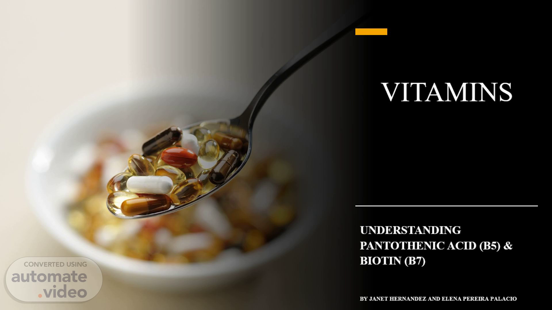 [Audio] Hello everyone! Today, we'll be talking about two essential vitamins: Vitamin B5, also known as Pantothenic Acid, and Vitamin B7, commonly referred to as Biotin. Both of these vitamins play key roles in maintaining our overall health, especially in energy metabolism..