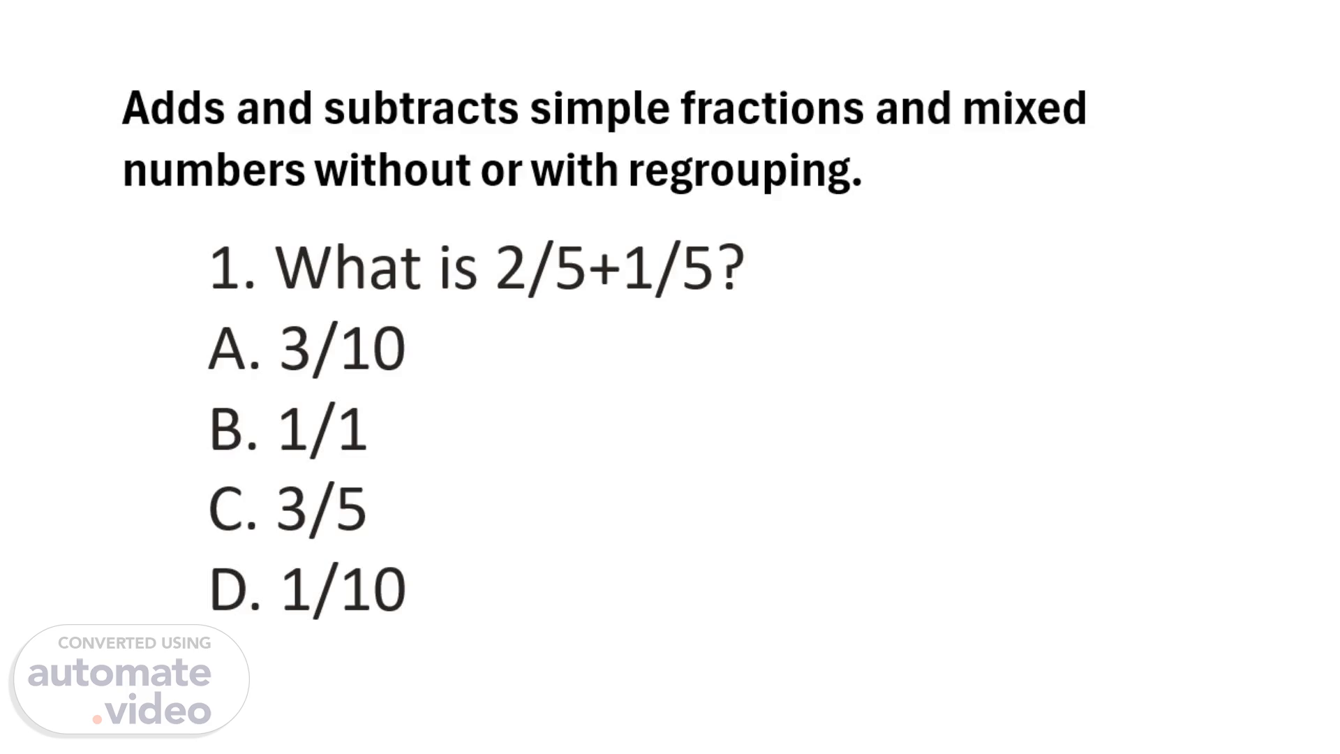 [Audio] Let us start with Competency 1: Adds and subtracts simple fractions and mixed numbers without or with regrouping. Question No. 1. What is 2/5 plus 1/5? A 3/10 B 1/1 C 3/5 D 1/10.