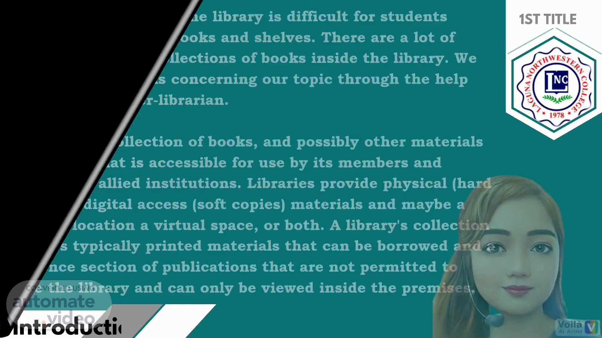 Introduction. Searching for books in the library is difficult for students because of numerous books and shelves. There are a lot of classifications and collections of books inside the library. We can access the books concerning our topic through the help librarian or teacher-librarian. A library is a collection of books, and possibly other materials and media, that is accessible for use by its members and members of allied institutions. Libraries provide physical (hard copies) or digital access (soft copies) materials and maybe a physical location a virtual space, or both. A library's collection includes typically printed materials that can be borrowed and a reference section of publications that are not permitted to leave the library and can only be viewed inside the premises..