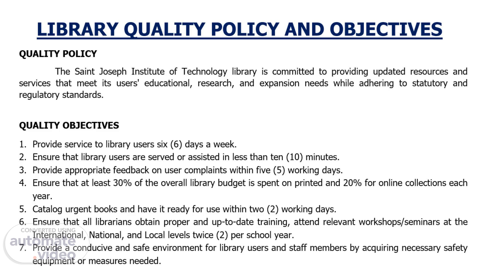 [Audio] QUALITY POLICY The Saint Joseph Institute of Technology library is committed to providing updated resources and services that meet its users' educational, research, and expansion needs while adhering to statutory and regulatory standards. QUALITY OBJECTIVES Provide service to library users six (6) days a week. Ensure that library users are served or assisted in less than ten (10) minutes. Provide appropriate feedback on user complaints within five (5) working days. Ensure that at least 30% of the overall library budget is spent on printed and 20% for online collections each year. Catalog urgent books and have it ready for use within two (2) working days. Ensure that all librarians obtain proper and up-to-date training, attend relevant workshops/seminars at the International, National, and Local levels twice (2) per school year. Provide a conducive and safe environment for library users and staff members by acquiring necessary safety equipment or measures needed..