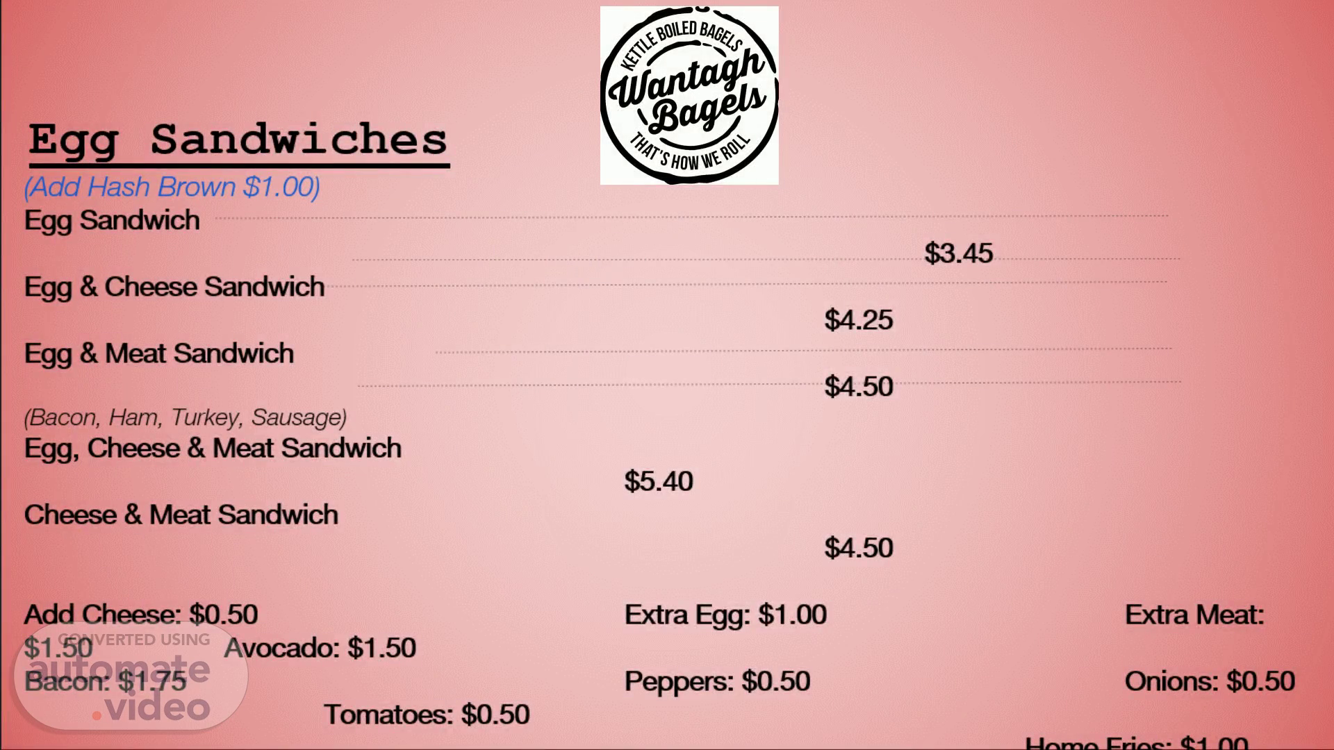 Egg Sandwiches. (Add Hash Brown $1.00) Egg Sandwich $3.45 Egg & Cheese Sandwich $4.25 Egg & Meat Sandwich $4.50 (Bacon, Ham, Turkey, Sausage) Egg, Cheese & Meat Sandwich $5.40 Cheese & Meat Sandwich $4.50 Add Cheese: $0.50 Extra Egg: $1.00 Extra Meat: $1.50 Avocado: $1.50 Bacon: $1.75 Peppers: $0.50 Onions: $0.50 Tomatoes: $0.50 Home Fries: $1.00.