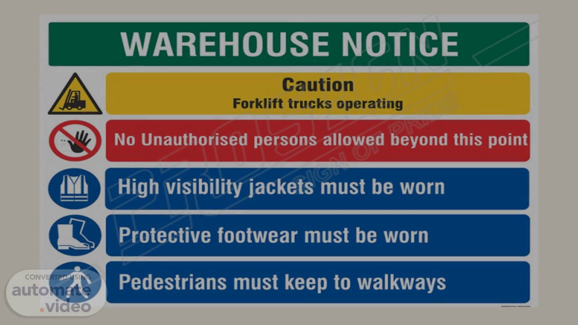 WAREHOUSE NOTICE Caution Forklift trucks operating No Unauthorised persons allowed beyond this point High visibility jackets must be worn Protective footwear must be worn Pedestrians must keep to walkways.
