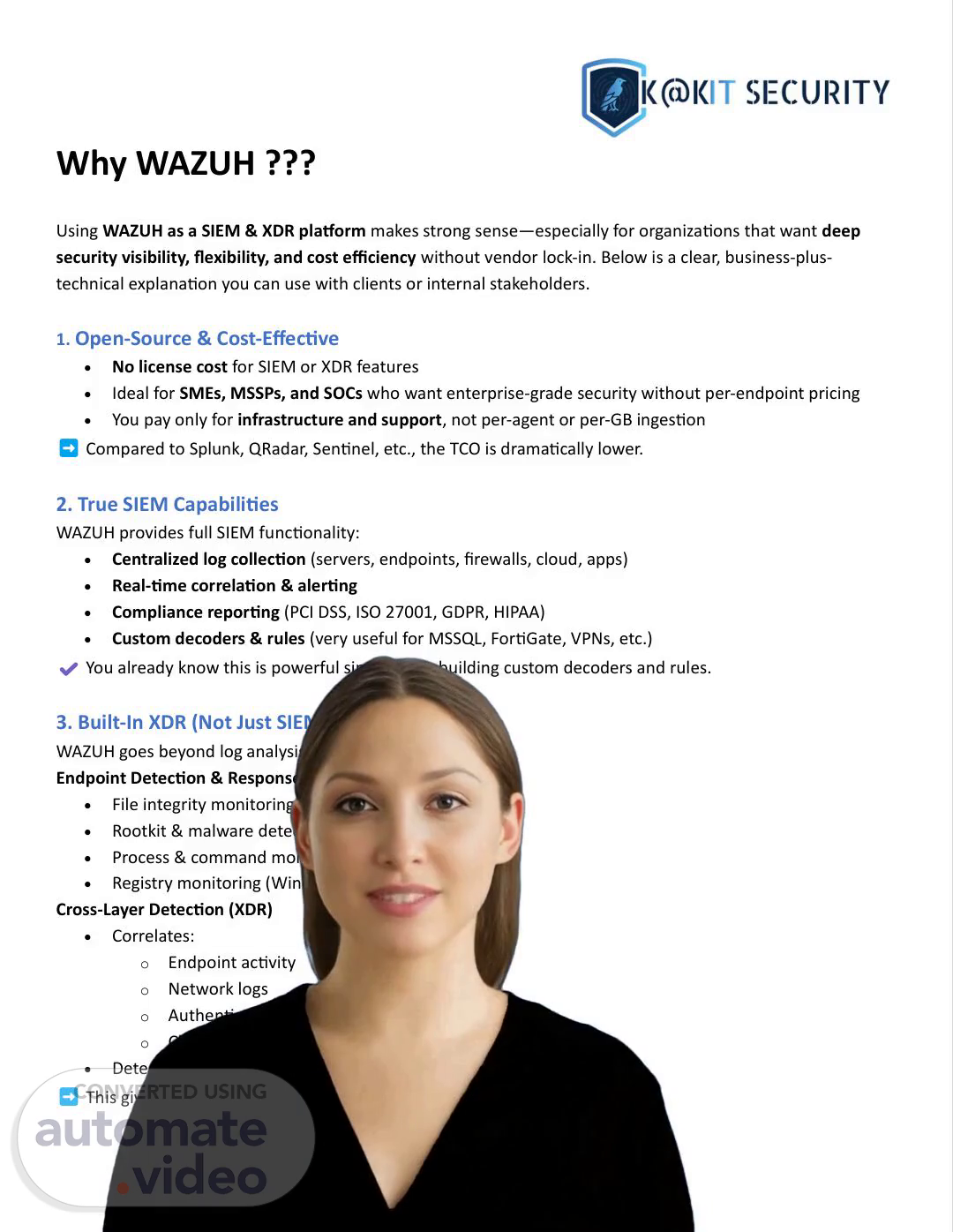 [Virtual Presenter] WAZUH provides an integrated security information and event management (SIEM) system with advanced threat detection capabilities, including machine learning-based anomaly detection and behavioral analysis. Its XDR (Extended Detection and Response) capabilities enable real-time monitoring and incident response, allowing organizations to quickly identify and contain potential security threats. The system also includes a user-friendly interface and customizable dashboards, facilitating easy access to critical security data and enabling users to make informed decisions about security posture. The open-source nature of WAZUH makes it highly accessible to organizations of all sizes, from small businesses to large enterprises, managed security service providers, and security operations centers. This accessibility is due to the elimination of licensing costs for SIEM and XDR features, which can be a significant burden for many organizations. Furthermore, WAZUH's flexible payment model allows customers to only pay for infrastructure and support, rather than per-agent or per-GB ingestion fees, making it more cost-efficient than traditional SIEM and XDR solutions. In contrast to other solutions like Splunk, QRadar, and Sentinel, WAZUH's total cost of ownership (TCO) is significantly lower. This is because WAZUH does not charge per-endpoint pricing, eliminating the need for additional licenses or subscriptions for each device or endpoint connected to the system. Instead, WAZUH offers a comprehensive suite of security features at a single, flat fee, providing a more streamlined and efficient approach to security management. Overall, WAZUH's unique combination of advanced security features, flexibility, and affordability make it an attractive option for organizations seeking enhanced security visibility, flexibility, and cost efficiency without being locked into a specific vendor. By leveraging WAZUH's open-source nature and flexible payment model, organizations can achieve a more secure and efficient security posture, while minimizing their costs and maximizing their return on investment..
