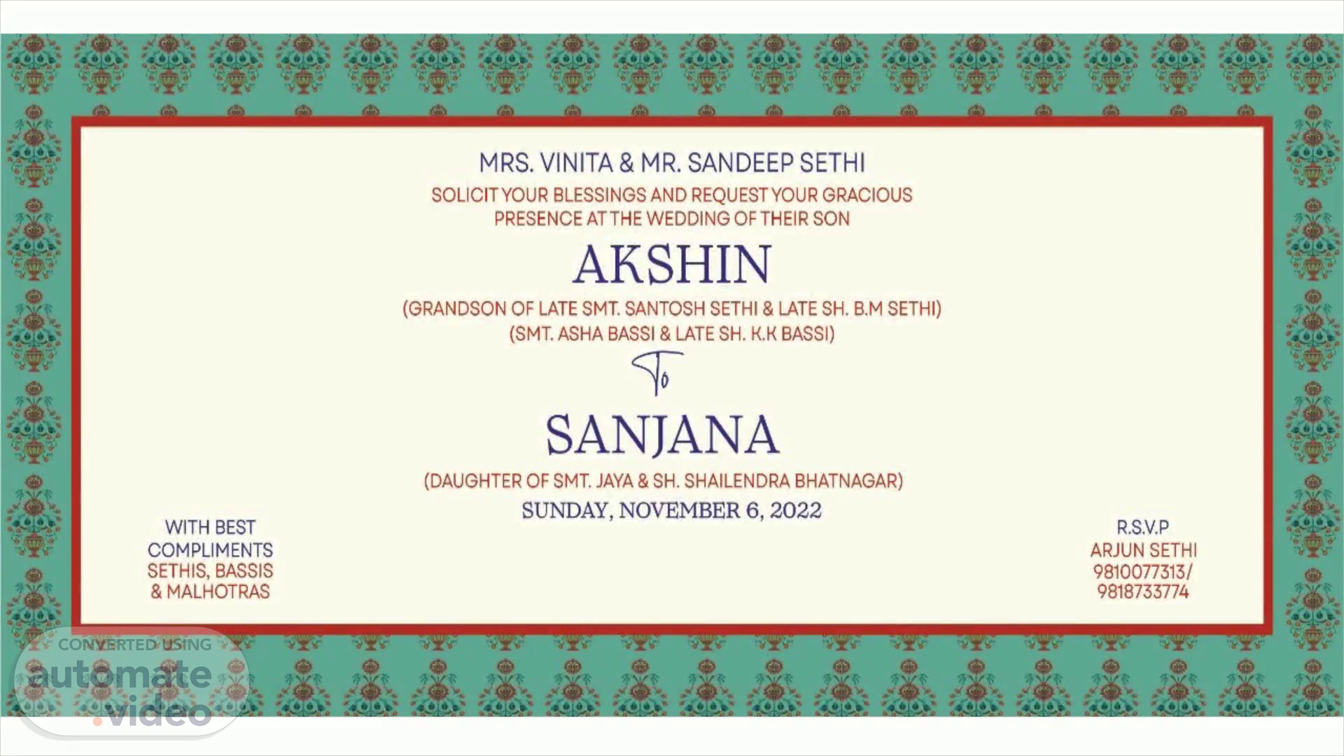 MRS. VINITA & MR. SANDEEP SETHI SOLICITYOUR BLESSINGS AND REQUESTYOUR GRACIOUS PRESENCE AT THE WEDDING OF THEIR SON AKSHIN (GRANDSON OF LATE SMT. SANTOSH SETHI & LATE SH. B.M SETHI) (SMT. ASHA BASSI & LATE SH. K.K BASSI) SANJANA (DAUGHTER OF SMT. JAYA & SH. SHAILENDRA BHATNAGAR) SUNDAY, NOVEMBER 6, 2022 WITH BEST COMPLIMENTS SETHIS, BASSIS & MALHOTRAS R.S.V.p ARJUN SETHI 9810077313/ 9818733774.