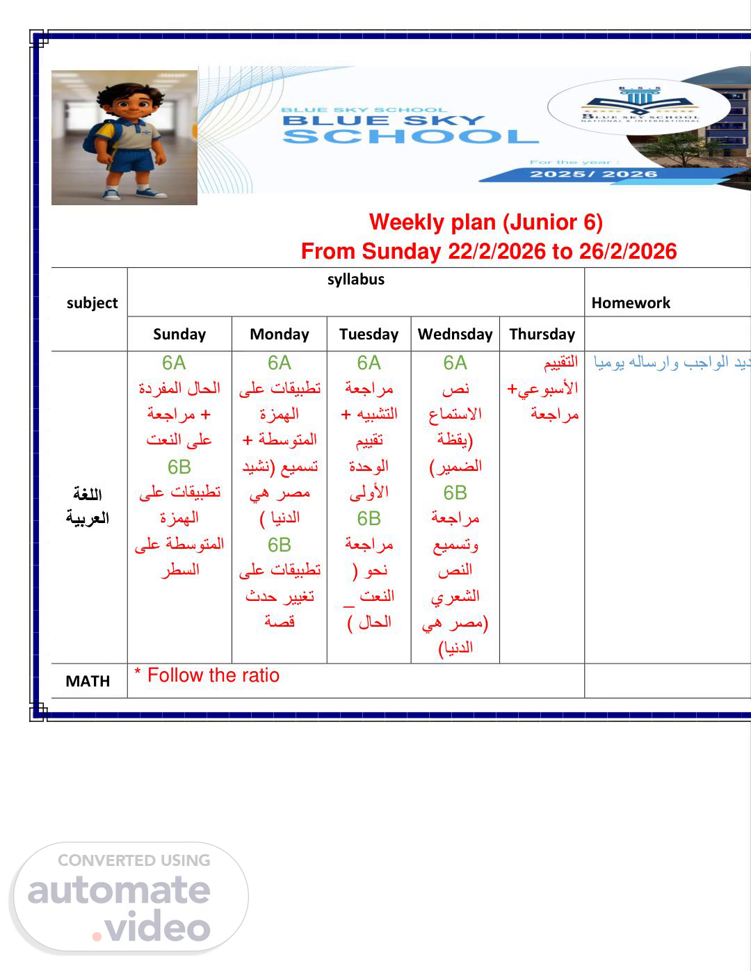 Weekly plan (Junior 6) From Sunday 22/2/2026 to 26/2/2026 subject syllabus Homework Assessment Day Sunday Monday Tuesday Wednsday Thursday ةغللا ةيبرعلا 6A ةدرفملا لاحلا ةعجارم + تعنلا ىلع 6B ىلع تاقيبطت ةزمهلا ىلع ةطسوتملا رطسلا 6A ىلع تاقيبطت ةزمهلا + ةطسوتملا ديشن( عيمست يه رصم ايندلا ) 6B ىلع تاقيبطت ثدح رييغت ةصق 6A ةعجارم + هيبشتلا مييقت ةدحولا ىلولأا 6B ةعجارم ( وحن _ تعنلا ) لاحلا 6A صن عامتسلاا ةظقي( )ريمضلا 6B ةعجارم عيمستو صنلا يرعشلا يه رصم( )ايندلا مييقتلا +يعوبسلأا ةعجارم فوسايموي هلاسراو بجاولا ديدحت متي MATH * Follow the ratio.