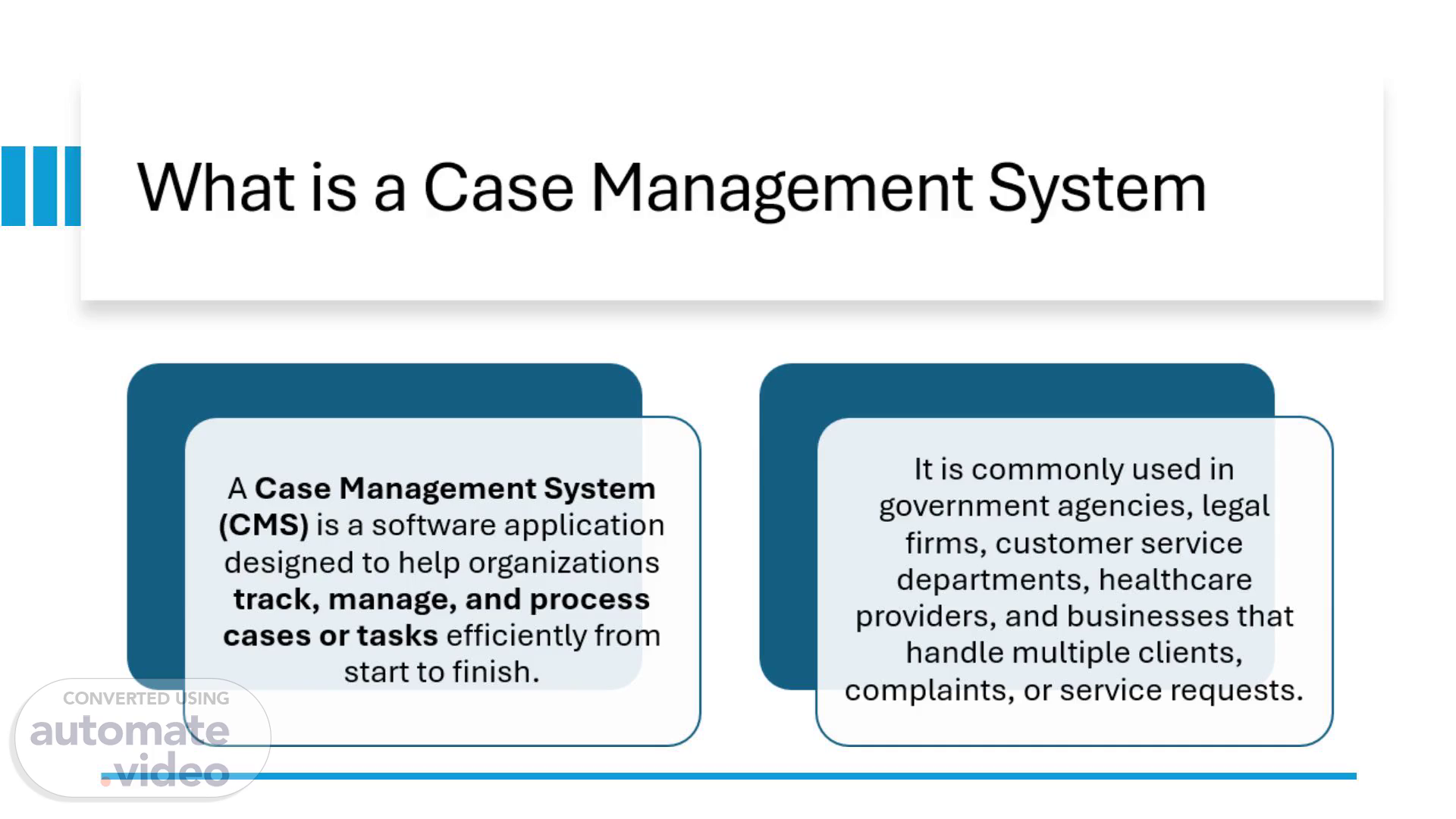 [Audio] What is a Case Management System A Case Management System (C-M-S--) is a software application designed to help organizations track, manage, and process cases or tasks efficiently from start to finish. It is commonly used in government agencies, legal firms, customer service departments, healthcare providers, and businesses that handle multiple clients, complaints, or service requests..