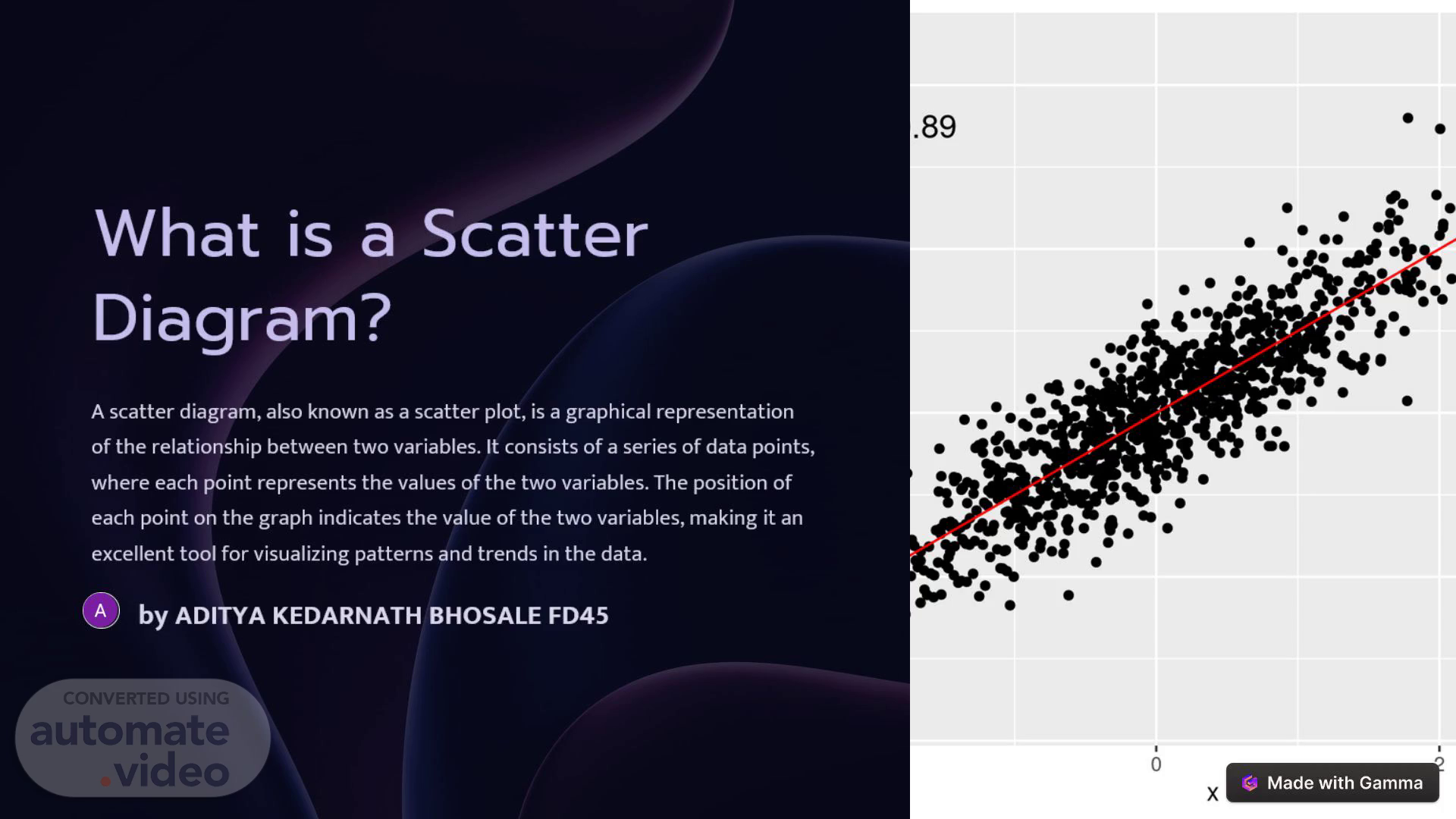 .89. What is a Scatter Diagram?. A scatter diagram, also known as a scatter plot, is a graphical representation of the relationship between two variables. It consists of a series of data points, where each point represents the values of the two variables. The position of each point on the graph indicates the value of the two variables, making it an excellent tool for visualizing patterns and trends in the data..