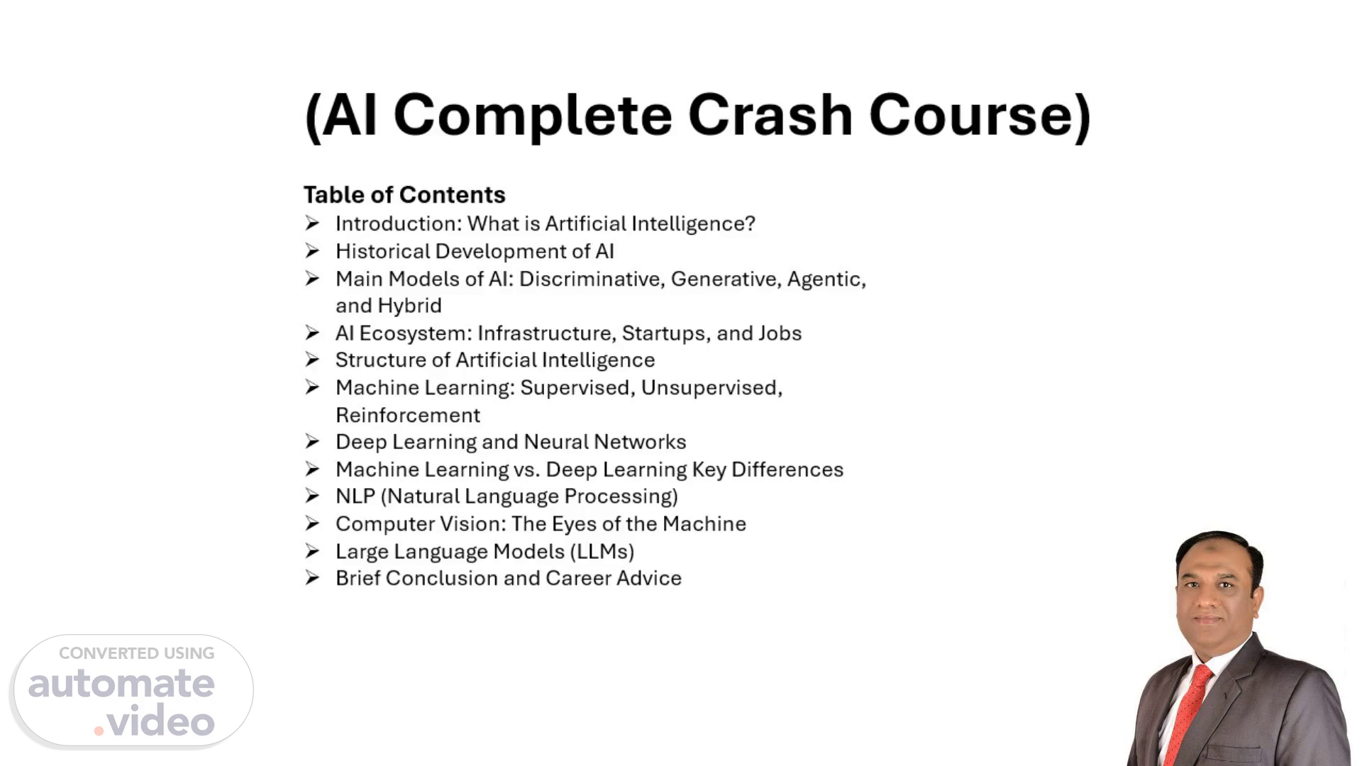 [Audio] AI Complete Crash Course Table of Contents Introduction: What is Artificial Intelligence? Historical Development of AI Main Models of AI: Discriminative, Generative, Agentic, and Hybrid AI Ecosystem: Infrastructure, Startups, and Jobs Structure of Artificial Intelligence Machine Learning: Supervised, Unsupervised, Reinforcement Deep Learning and Neural Networks Machine Learning vs. Deep Learning Key Differences NLP (Natural Language Processing) Computer Vision: The Eyes of the Machine Large Language Models (LLMs) Brief Conclusion and Career Advice.