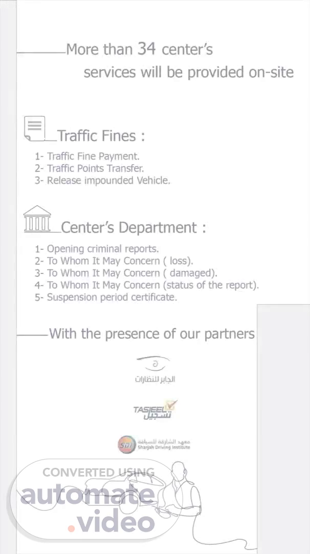 More than 34 center's services will be provided on-site Traffic Fines : I- Traffic Fine Payment. 2- Traffic Points Transfer. 3- Release impounded Vehicle. Z—Center's Department : I- Opening criminal reports. 2- To Whom It May Concern ( loss). 3- To Whom It May Concern ( damaged). 4- To Whom It May Concern (status of the report). 5- Suspension period certificate. With the presence of our partners ülJlhiLJ pl*Jl.