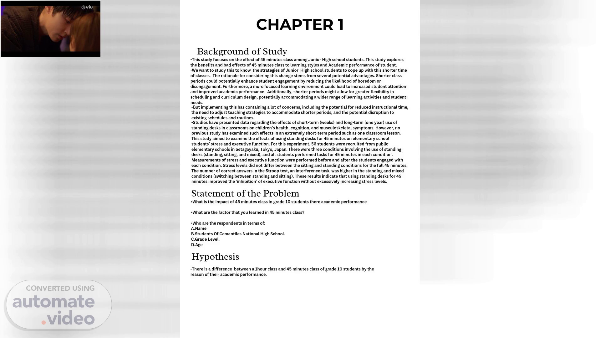 [Audio] . CHAPTER 1 Background of Study -This study focuses on the effect of 45 minutes class among Junior High school students. This study explores the benefits and bad effects of 45 minutes class to learning styles and Academic performance of student. -We want to study this to know the strategies of Junior High school students to cope up with this shorter time of classes. The rationale for considering this change stems from several potential advantages. Shorter class periods could potentially enhance student engagement by reducing the likelihood of boredom or disengagement. Furthermore, a more focused learning environment could lead to increased student attention and improved academic performance. Additionally, shorter periods might allow for greater flexibility in scheduling and curriculum design, potentially accommodating a wider range of learning activities and student needs. -But implementing this has containing a lot of concerns, including the potential for reduced instructional time, the need to adjust teaching strategies to accommodate shorter periods, and the potential disruption to existing schedules and routines. -Studies have presented data regarding the effects of short-term (weeks) and long-term (one year) use of standing desks in classrooms on children's health, cognition, and musculoskeletal symptoms. However, no previous study has examined such effects in an extremely short-term period such as one classroom lesson. This study aimed to examine the effects of using standing desks for 45 minutes on elementary school students' stress and executive function. For this experiment, 56 students were recruited from public elementary schools in Setagayaku, Tokyo, Japan. There were three conditions involving the use of standing desks (standing, sitting, and mixed), and all students performed tasks for 45 minutes in each condition. Measurements of stress and executive function were performed before and after the students engaged with each condition. Stress levels did not differ between the sitting and standing conditions for the full 45 minutes. The number of correct answers in the Stroop test, an interference task, was higher in the standing and mixed conditions (switching between standing and sitting). These results indicate that using standing desks for 45 minutes improved the 'inhibition' of executive function without excessively increasing stress levels. Statement of the Problem •What is the impact of 45 minutes class in grade 10 students there academic performance •What are the factor that you learned in 45 minutes class? •Who are the respondents in terms of: A.Name B.Students Of Camantiles National High School. C.Grade Level. D Age Hypothesis -There is a difference between a lhour class and 45 minutes class of grade 10 students bythe reason of their academic performance..