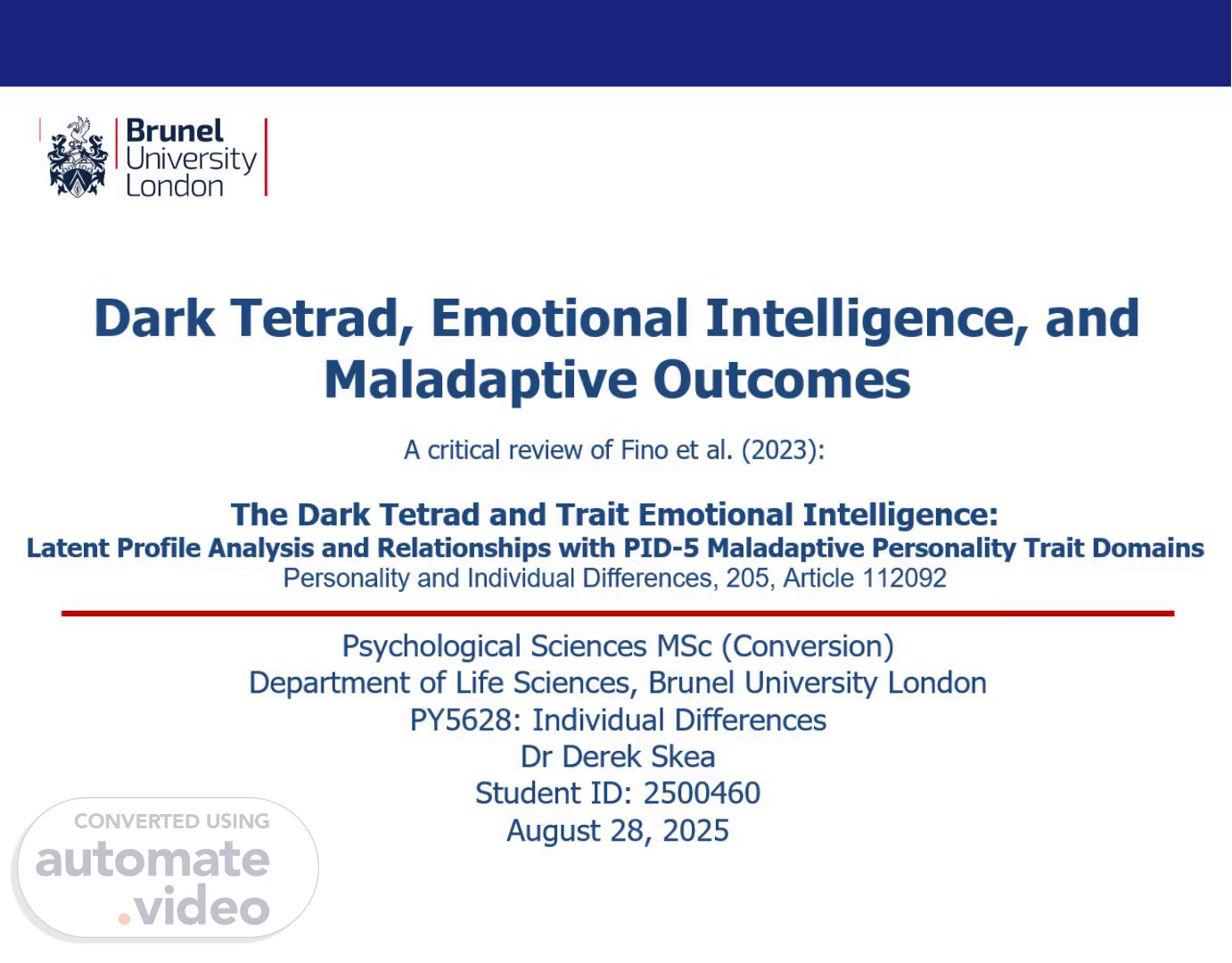 [Audio] Welcome to this presentation on "The Dark Tetrad and Trait Emotional Intelligence: A Critical Review of Fino et al. (2023)." This presentation is for PY5628: Individual Differences, presented by student ID 2500460 on August 28, 2025. Today, I'll be reviewing a recent paper that explores the relationship between Dark Tetrad personality traits and emotional intelligence, and how these relate to maladaptive personality outcomes..