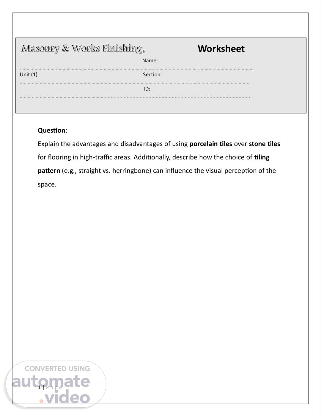 [Audio] Masonry & Works Finishing. Worksheet Name: .……………………….………………………………………………………………………………………………………………………………… Unit (1) Section: ………………………………………………………………………………………………………………………………………………………… ID: ………………………………………………………..................................................................................................... Question: Explain the advantages and disadvantages of using porcelain tiles over stone tiles for flooring in high-traffic areas. Additionally, describe how the choice of tiling pattern (for example, straight against herringbone) can influence the visual perception of the space. 1 | P a g e.