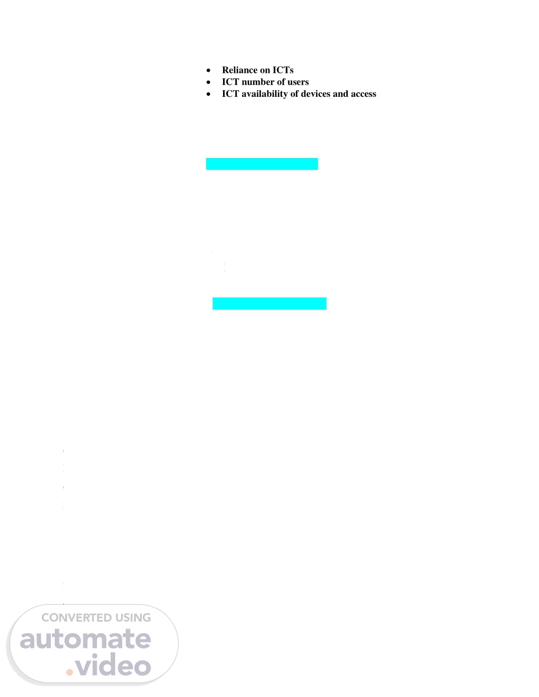 • Reliance on ICTs. • ICT number of users. • ICT availability of devices and access.