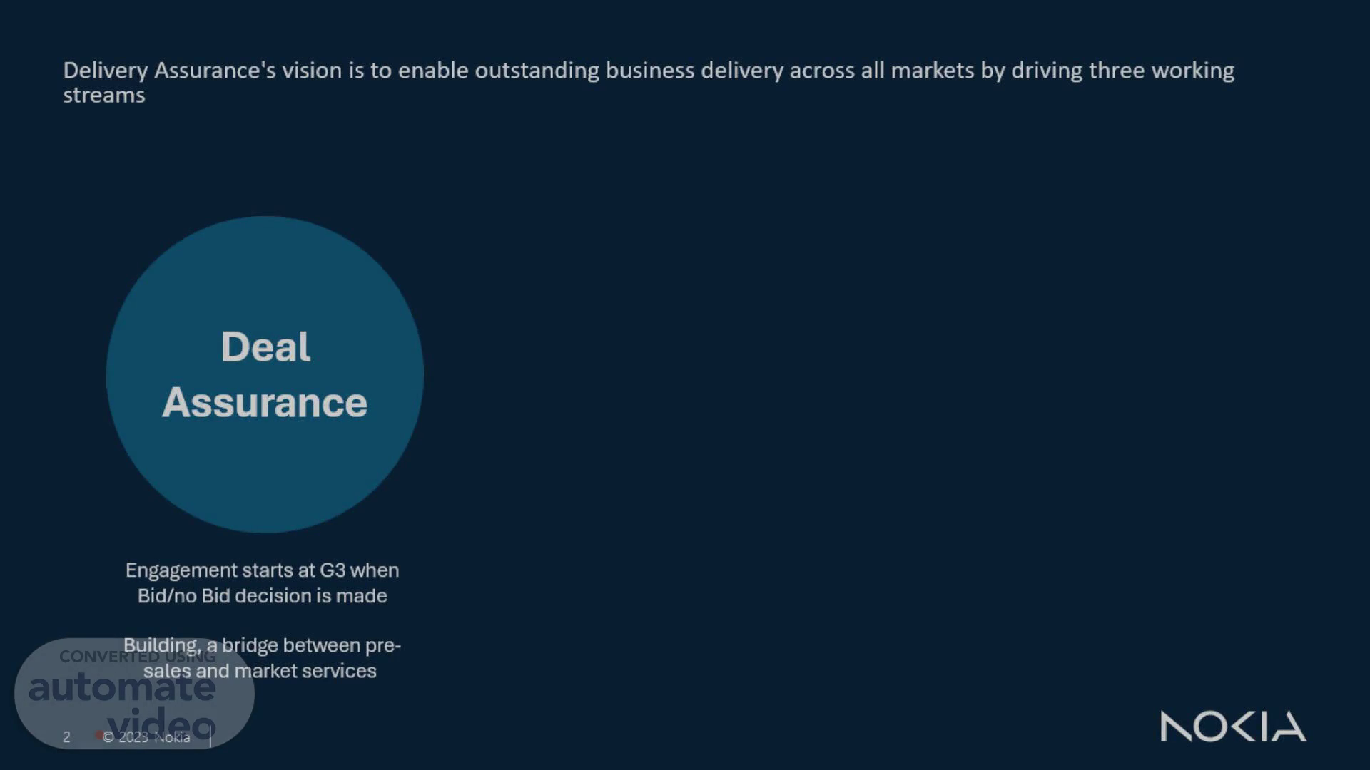 [Virtual Presenter] We are diving into Delivery Assurance and its pivotal role in enabling outstanding business delivery across all markets. Our vision for Delivery Assurance centers around driving three essential working streams. Firstly, we have Deal Assurance : This critical phase initiates at G3, coinciding with the Bid/no Bid decision-making process. Here, we meticulously evaluate opportunities to ensure strategic alignment and maximize our potential for success..