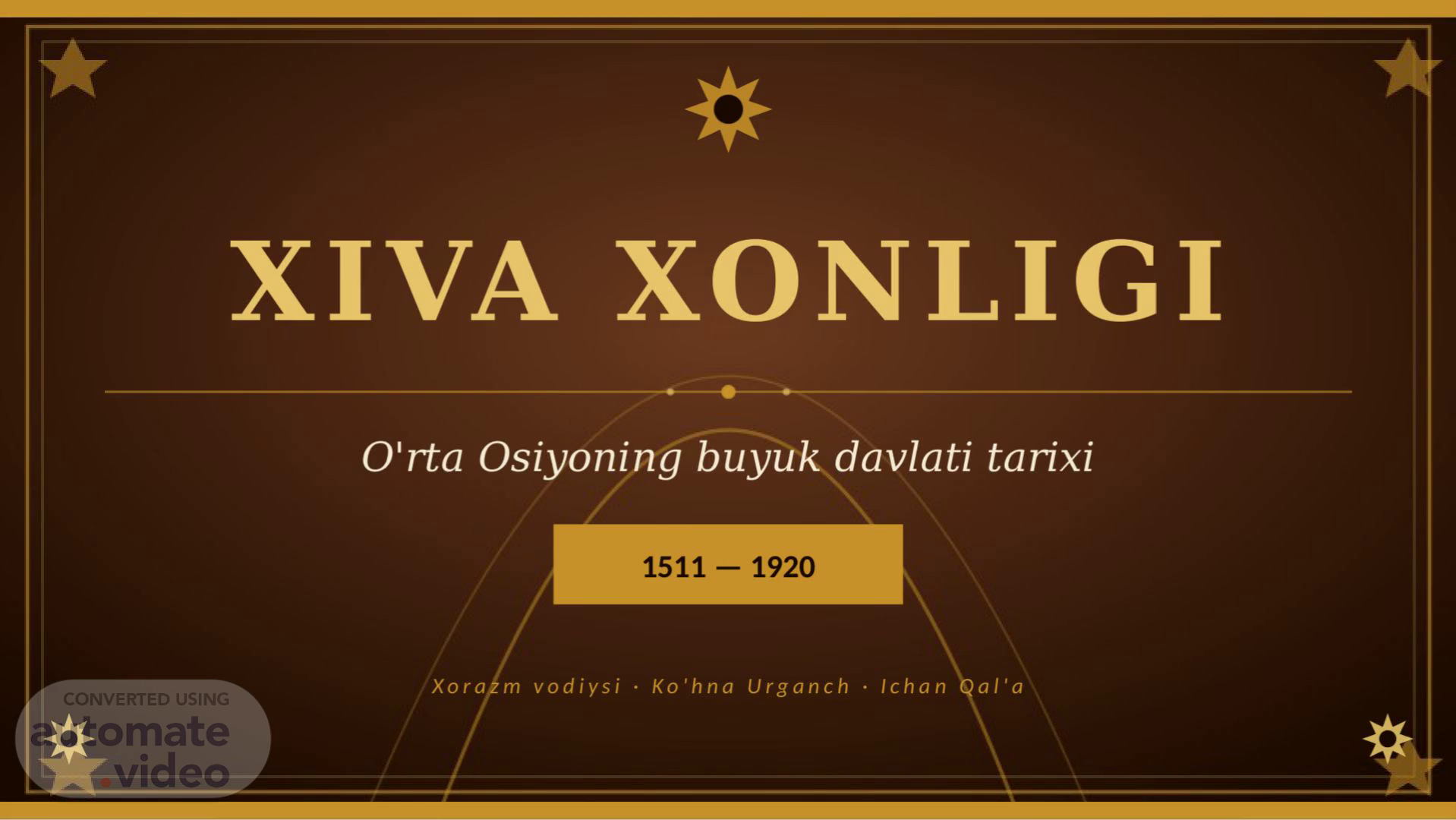 K I R I S H Xiva Xonligi haqida Xiva xonligi — O'rta Osiyoda XVI asrda tashkil topgan va XX asr boshigacha mavjud bo'lgan mustaqil davlat. U Xorazm vodiysida, Amudaryo quyi oqimida joylashgan bo'lib, qadimgi Xorazm davlatining vorisi hisoblanadi. Xiva xonligi paytasxti sifatida Xiva shahri xizmat qilgan. Davlat Shayboniylar sulolasidan chiqqan xonlar tomonidan boshqarilgan. O'z tarixida xonlik madaniyat, me'morchilik va ilm-fan sohasida yuksak darajaga erishgan..