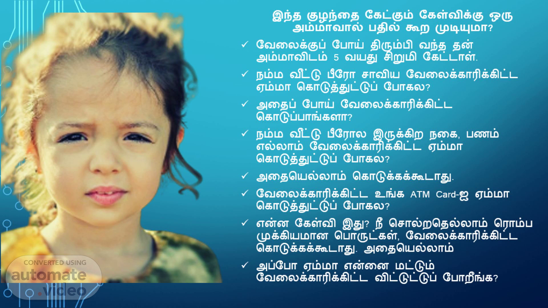 இந்த குழந்தை கேட்கும் கேள்விக்கு ஒரு அம்மாவால் பதில் கூற முடியுமா? வேலைக்குப் போய் திரும்பி வந்த தன் அம்மாவிடம் 5 வயது சிறுமி கேட்டாள். நம்ம வீட்டு பீரோ சாவிய வேலைக்காரிக்கிட்ட ஏம்மா கொடுத்துட்டுப் போகல? அதைப் போய் வேலைக்காரிக்கிட்ட கொடுப்பாங்களா? நம்ம வீட்டு பீரோல இருக்கிற நகை, பணம் எல்லாம் வேலைக்காரிக்கிட்ட ஏம்மா கொடுத்துட்டுப் போகல? அதையெல்லாம் கொடுக்கக்கூடாது. வேலைக்காரிக்கிட்ட உங்க ATM Card-ஐ ஏம்மா கொடுத்துட்டுப் போகல? என்ன கேள்வி இது? நீ சொல்றதெல்லாம் ரொம்ப முக்கியமான பொருட்கள், வேலைக்காரிக்கிட்ட கொடுக்கக்கூடாது. அதையெல்லாம் அப்போ ஏம்மா என்னை மட்டும் வேலைக்காரிக்கிட்ட விட்டுட்டுப் போறீங்க?.