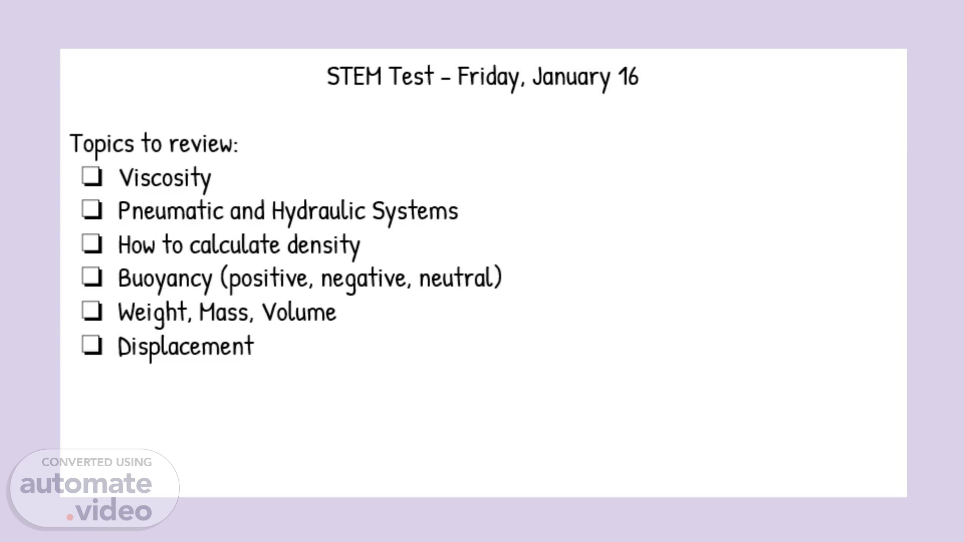 [Audio] S-T-E-M Test Friday, January 16 Topics to review: Viscosity Pneumatic and Hydraulic Systems How to calculate density Buoyancy (positive, negative, neutral) Weight, Mass, Volume Displacement.