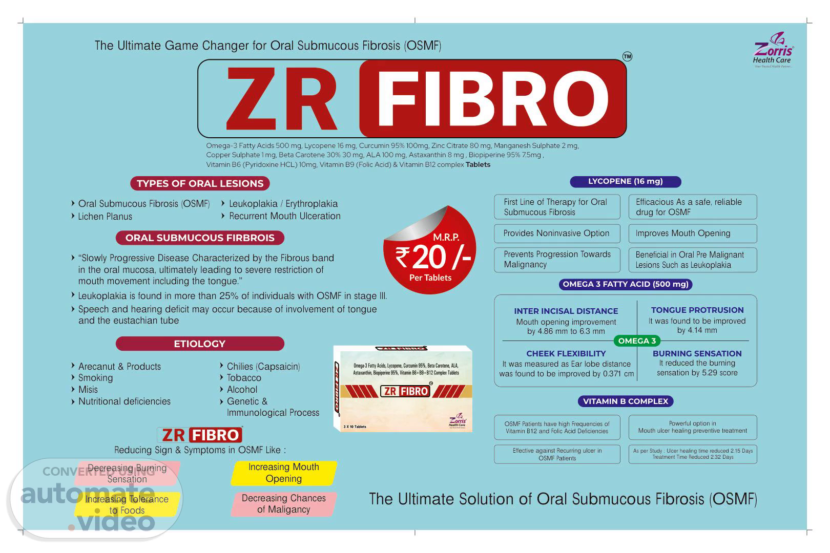 [Audio] The Ultimate Game Changer for Oral Submucous Fibrosis (OSMF) Omega-3 Fatty Acids 500 mg, Lycopene 16 mg, Curcumin 95% 100mg, Zinc Citrate 80 mg, Manganesh Sulphate 2 mg, Copper Sulphate 1 mg, Beta Carotene 30% 30 mg, ALA 100 mg, Astaxanthin 8 mg , Biopiperine 95% 7.5mg , Vitamin B6 (Pyridoxine HCL) 10mg, Vitamin B9 (Folic Acid) & Vitamin B12 complex Tablets LYCOPENE (16 mg) TYPES OF ORAL LESIONS First Line of Therapy for Oral Submucous Fibrosis Efficacious As a safe, reliable drug for OSMF Leukoplakia / Erythroplakia Recurrent Mouth Ulceration Oral Submucous Fibrosis (OSMF) Lichen Planus Improves Mouth Opening Provides Noninvasive Option M.R.P. ORAL SUBMUCOUS FIRBROIS Prevents Progression Towards Malignancy Beneficial in Oral Pre Malignant Lesions Such as Leukoplakia 20 /- Per Tablets "Slowly Progressive Disease Characterized by the Fibrous band in the oral mucosa, ultimately leading to severe restriction of mouth movement including the tongue." OMEGA 3 FATTY ACID (500 mg) TONGUE PROTRUSION It was found to be improved Leukoplakia is found in more than 25% of individuals with OSMF in stage lll. Speech and hearing deficit may occur because of involvement of tongue and the eustachian tube INTER INCISAL DISTANCE Mouth opening improvement by 4.14 mm by 4.86 mm to 6.3 mm OMEGA 3 ETIOLOGY CHEEK FLEXIBILITY BURNING SENSATION It reduced the burning sensation by 5.29 score It was measured as Ear lobe distance was found to be improved by 0.371 cm VITAMIN B COMPLEX Arecanut & Products Smoking Misis Nutritional deficiencies Chilies (Capsaicin) Tobacco Alcohol Genetic & Immunological Process Powerful option in Mouth ulcer healing preventive treatment OSMF Patients have high Frequencies of Vitamin B12 and Folic Acid Deficiencies As per Study : Ulcer healing time reduced 2.15 Days Effective against Recurring ulcer in Reducing Sign & Symptoms in OSMF Like : Treatment Time Reduced 2.32 Days OSMF Patients Increasing Mouth Decreasing Burning Opening Sensation Decreasing Chances Increasing Tolerance of Maligancy The Ultimate Solution of Oral Submucous Fibrosis (OSMF) to Foods.